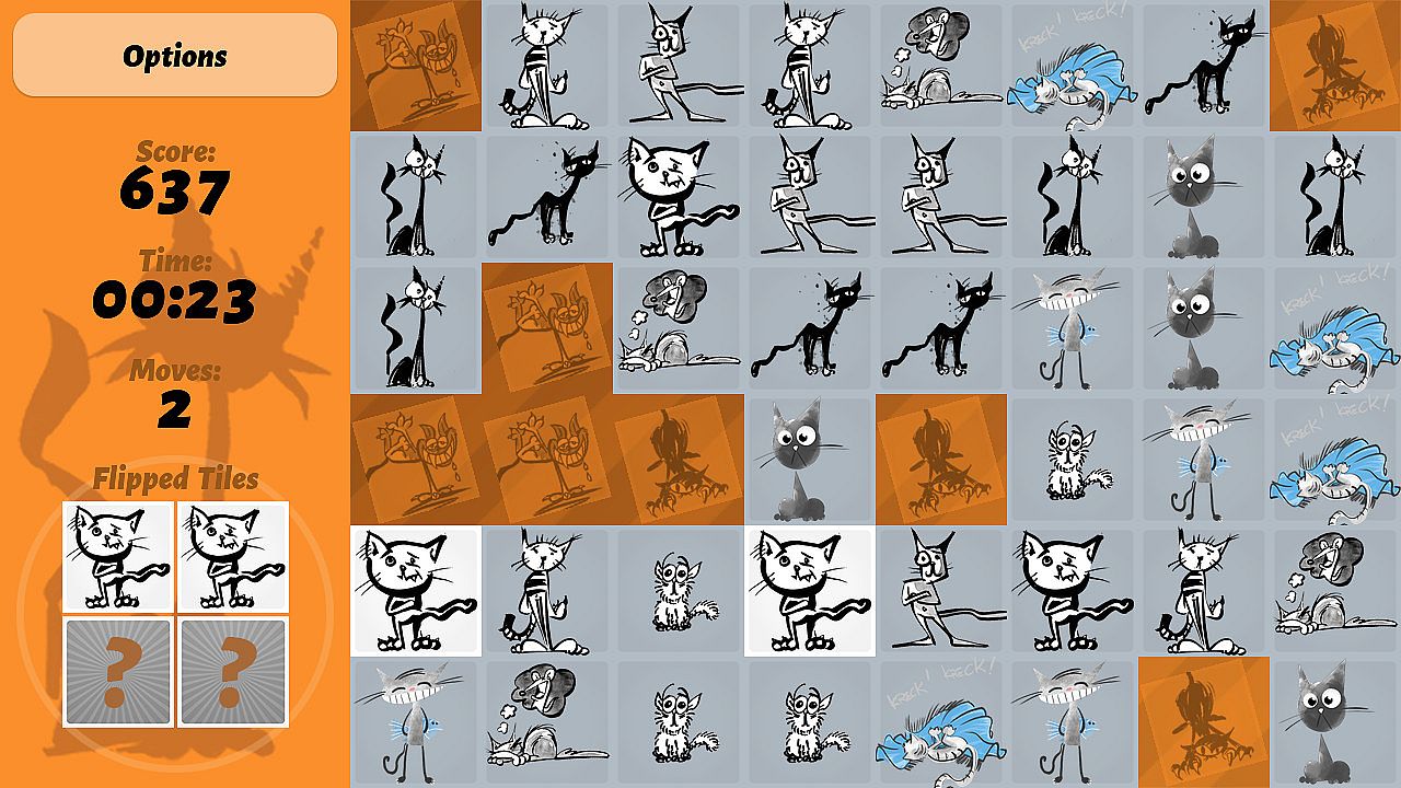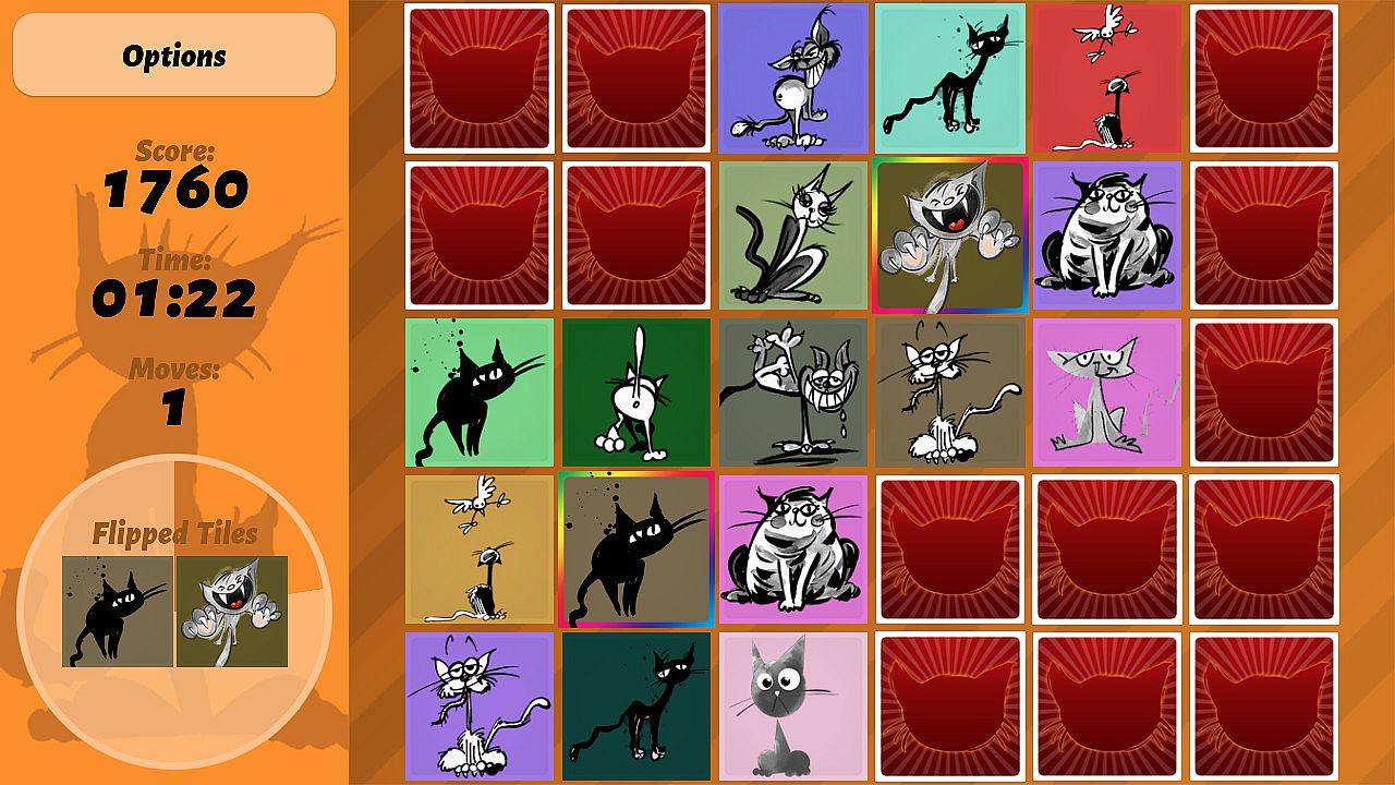 If the revealed cats are identical, the tiles are claimed and your score increases. Otherwise, the tiles are flipped back and you can continue flipping up other tiles.