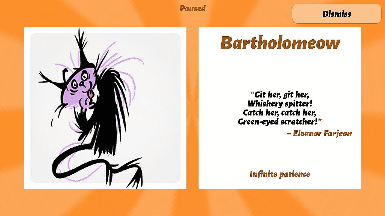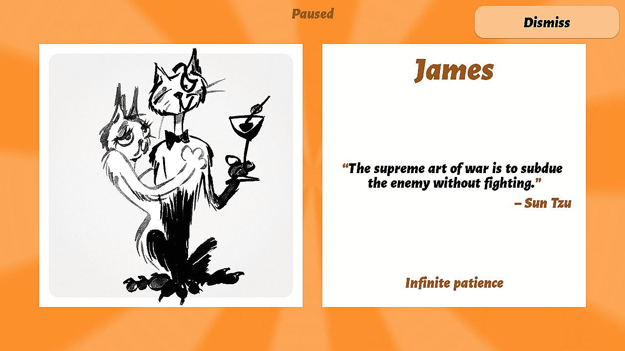 Select flipped or claimed tiles to reveal a full screen image with the cat’s name, their favorite quote and a special information (i.e. Patience, Monster or Psychedelic Mood status.)