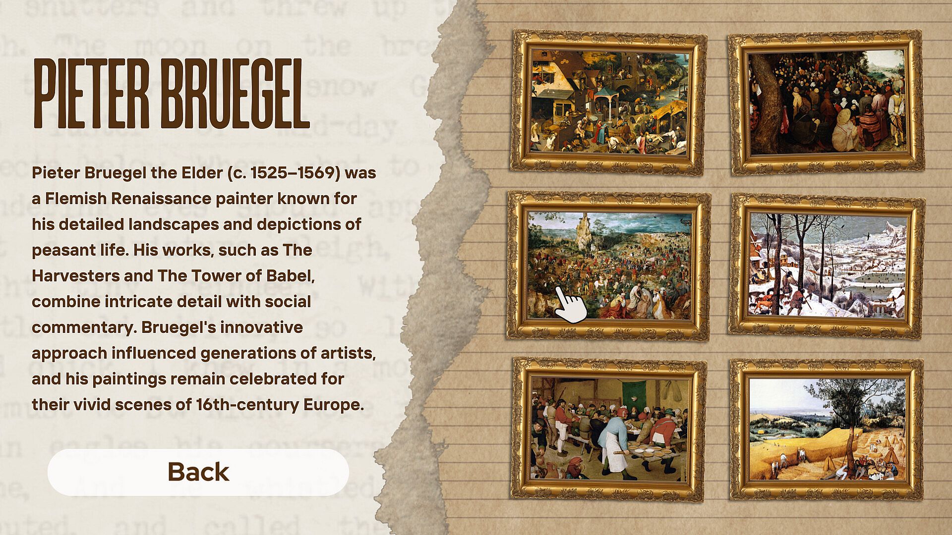 • Interactive Tools: Use zoom and hint features to examine every detail of the paintings.