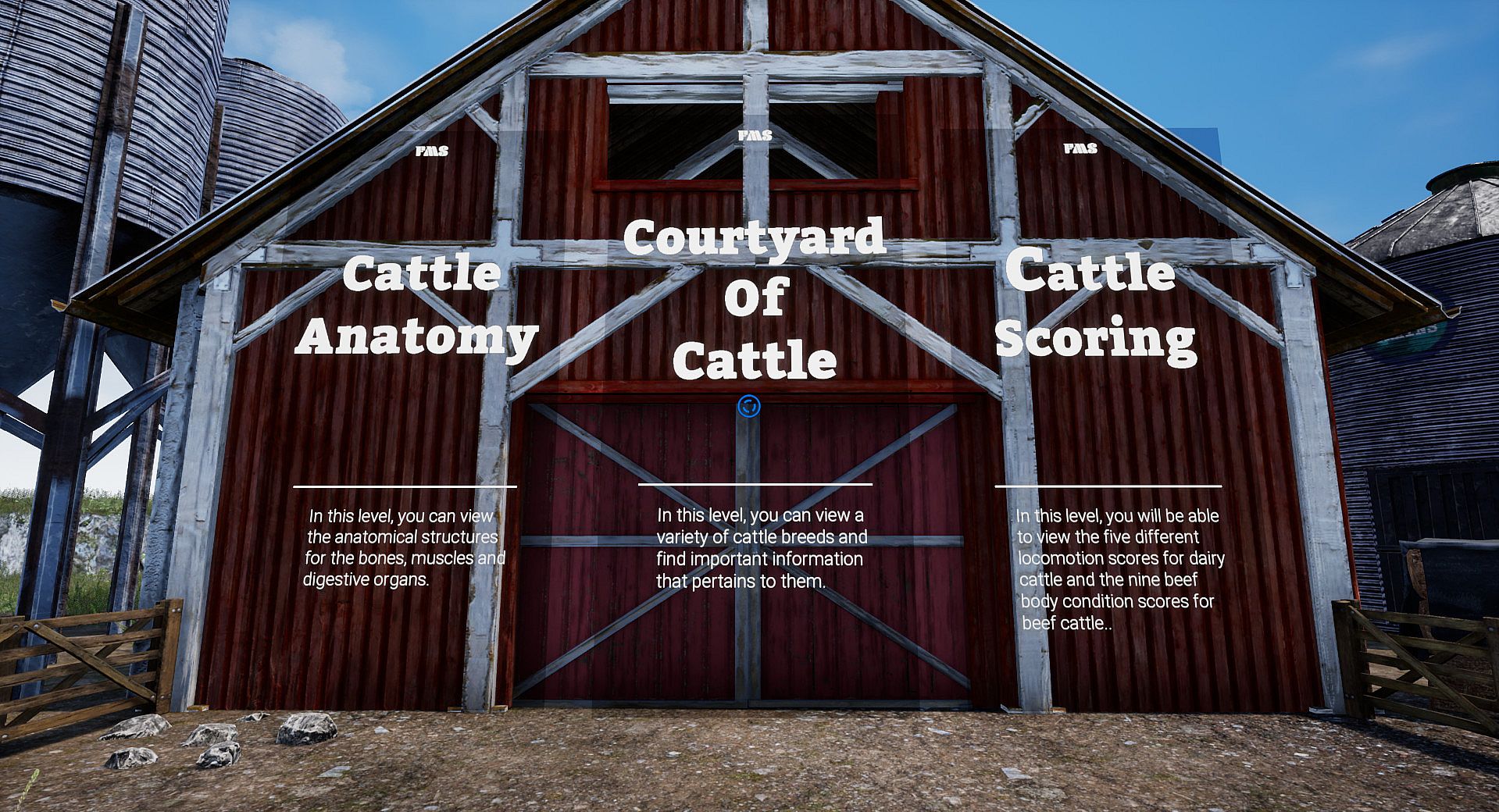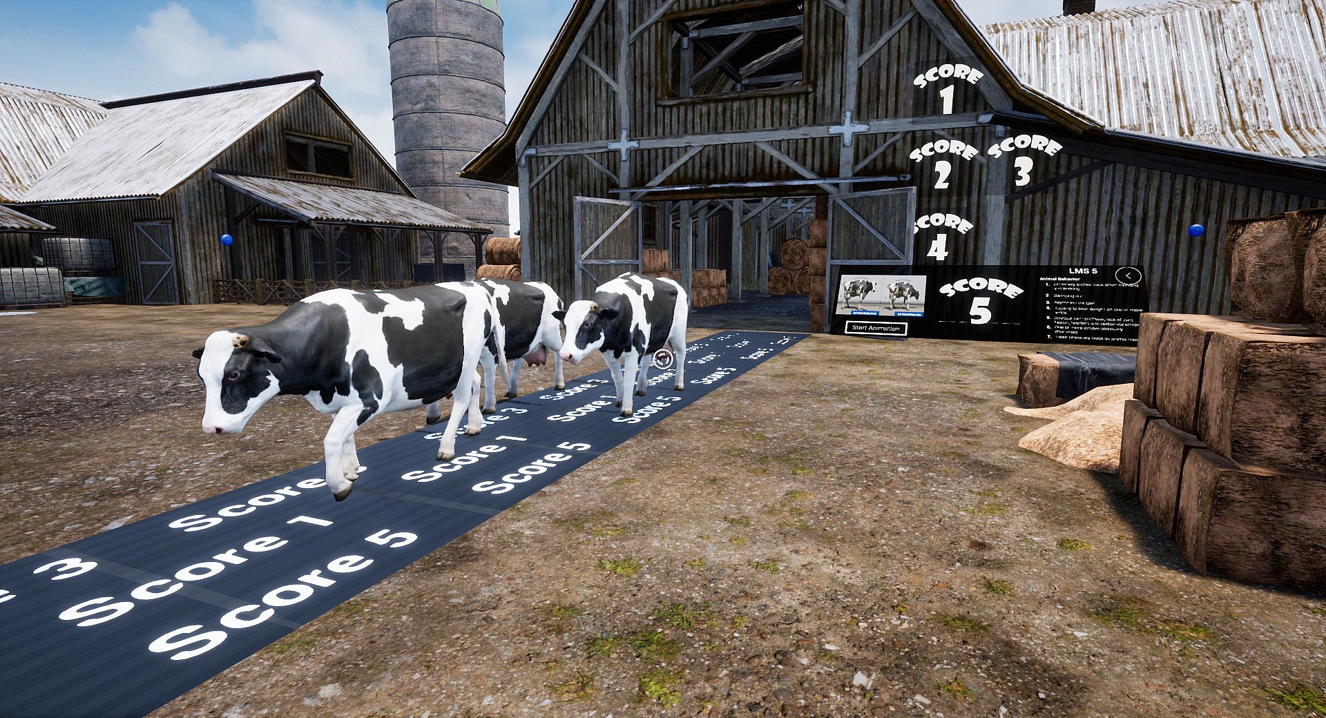3. The last area is cattle scoring, where the player can learn about how cattle are scored in real life; the two examples we have to present are dairy cattle locomotion scoring and beef body condition scoring.