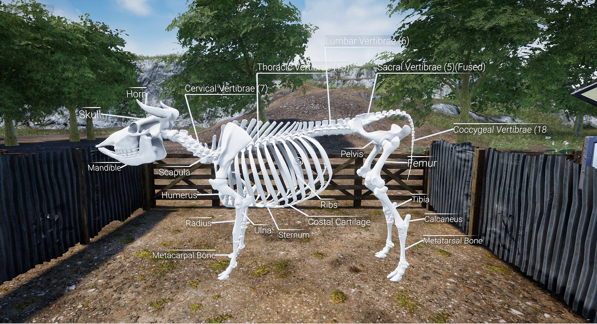 Students explore cattle breeds, anatomy, and scoring in this indie simulation sample from Cattle 101. The Courtyard of Cattle displays 3D models and details for twenty popular breeds. Players interact with these models to grasp key breed traits. In the anatomy section, 3D representations of bones, muscles, and digestive organs let players select items for detailed information. The scoring area covers real-world methods like dairy cattle locomotion and beef body condition scoring. This simulation suits students learning livestock concepts hands-on.