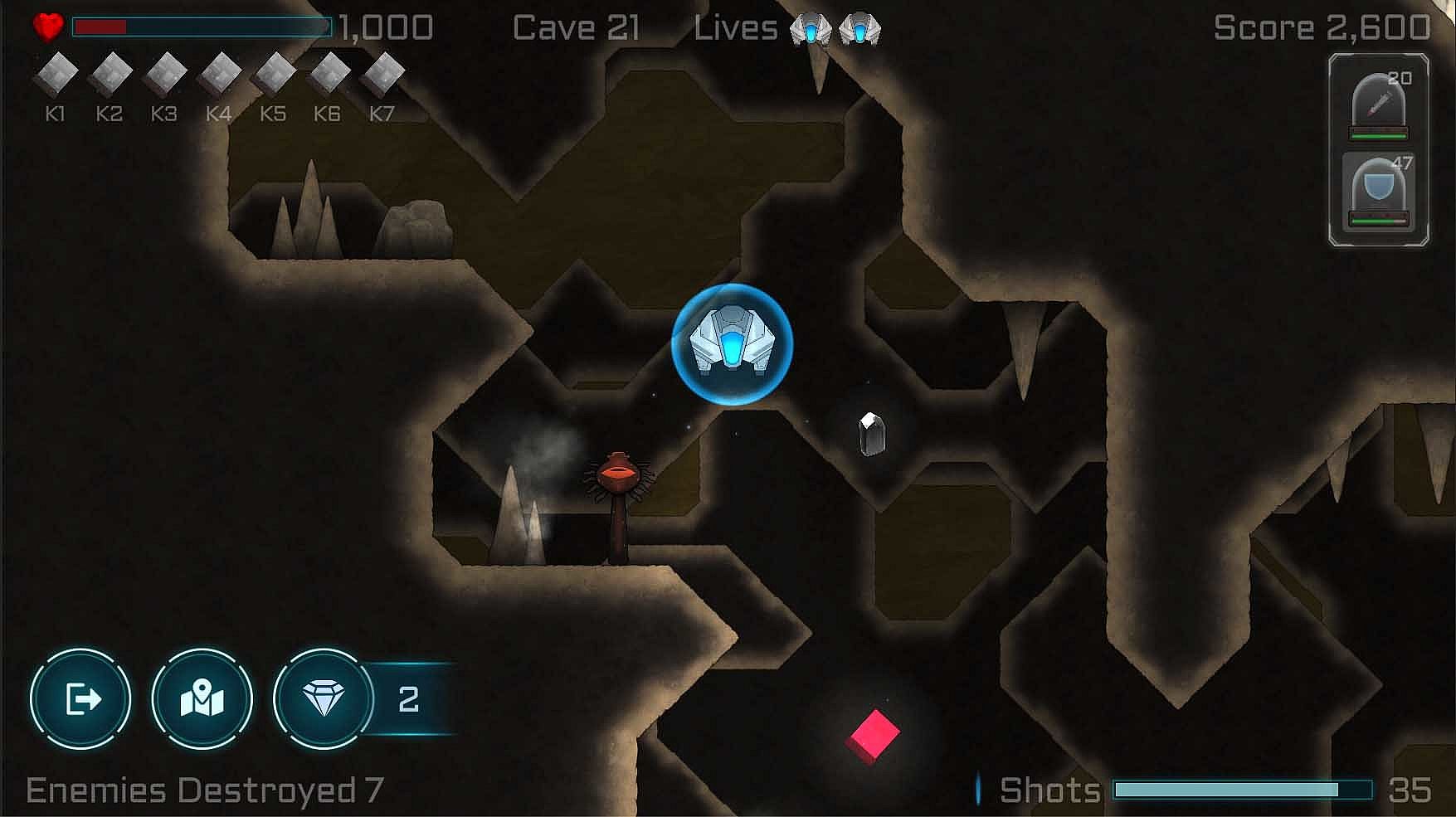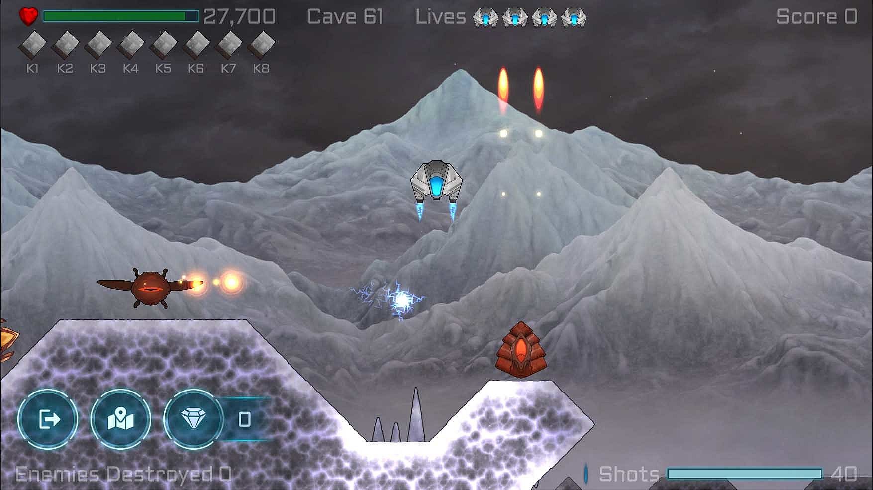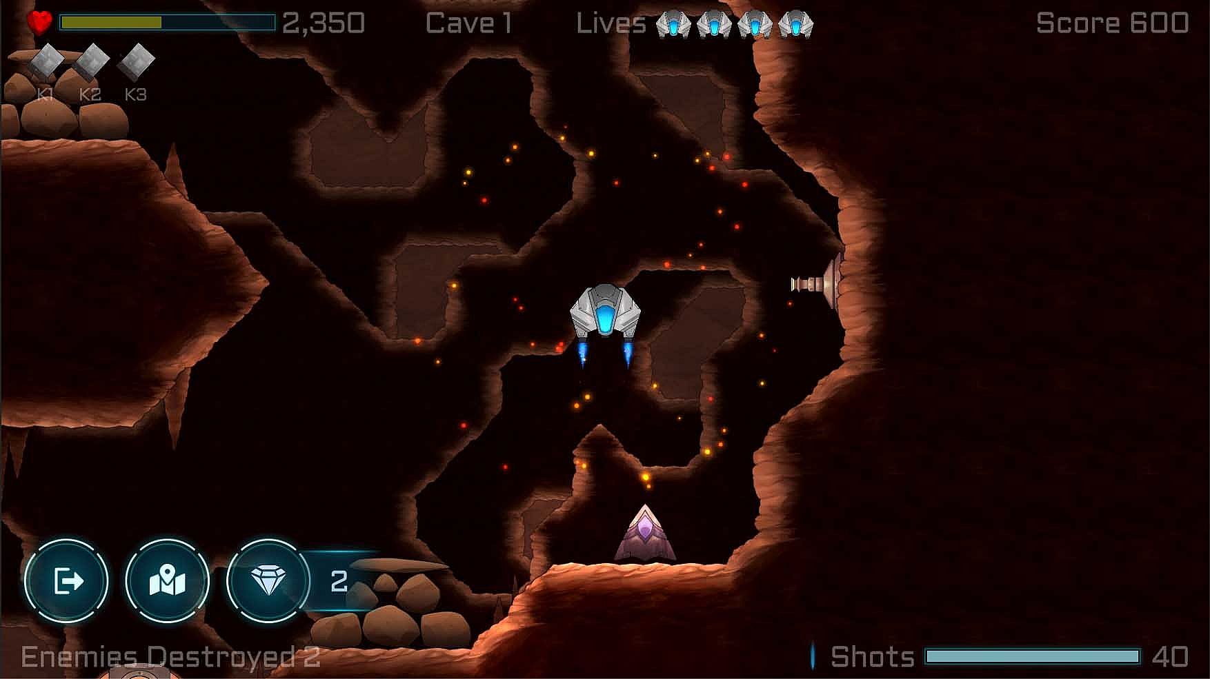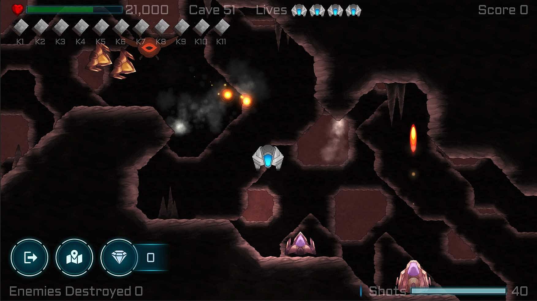 Navigate your spacecraft through these caves, destroy enemies and alien lifeforms and collect as many gems as possible. Collecting gems will increase your health and gain points. You will gain extra bonus points the more gems you collect and enemies you destroy.