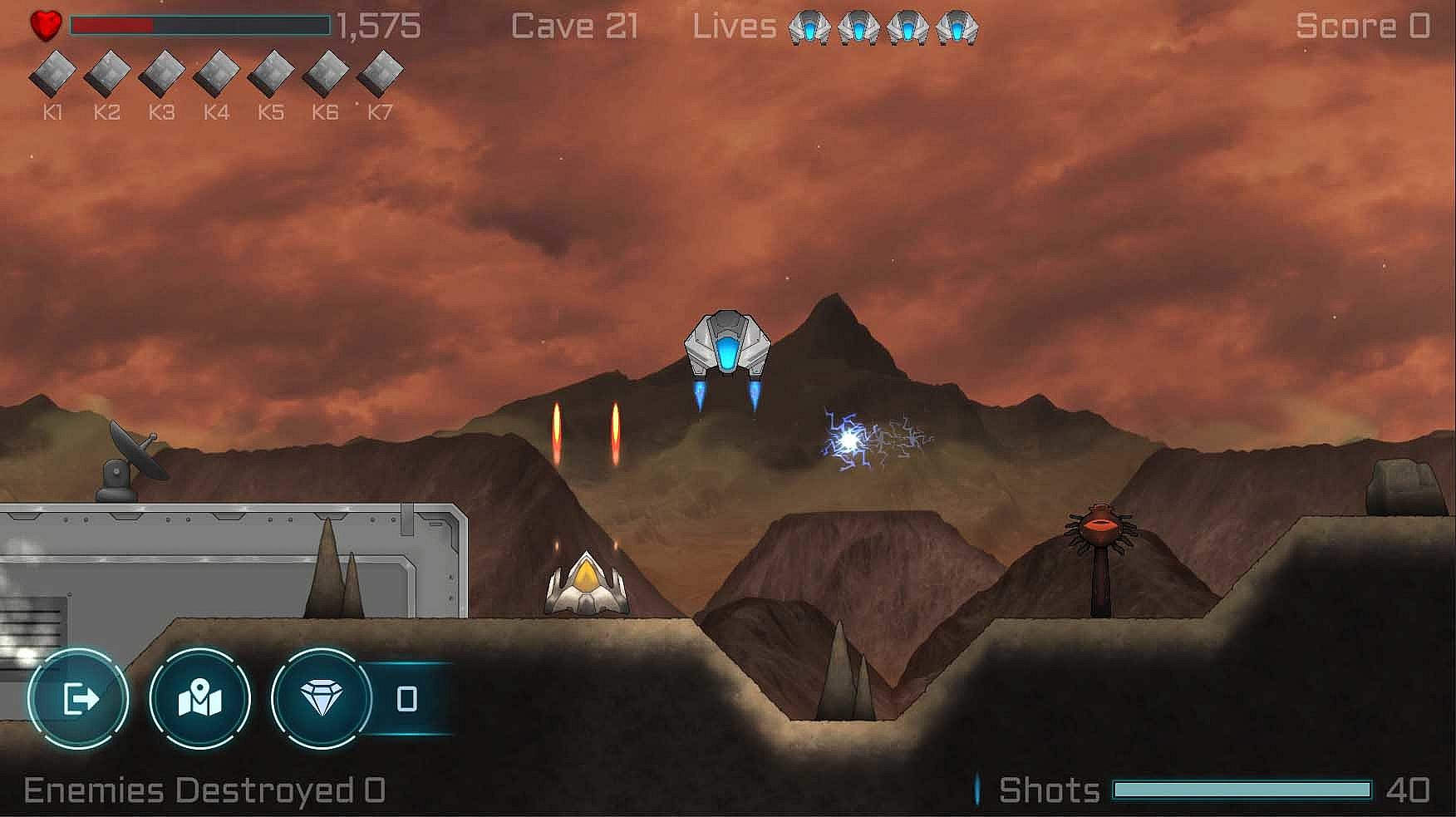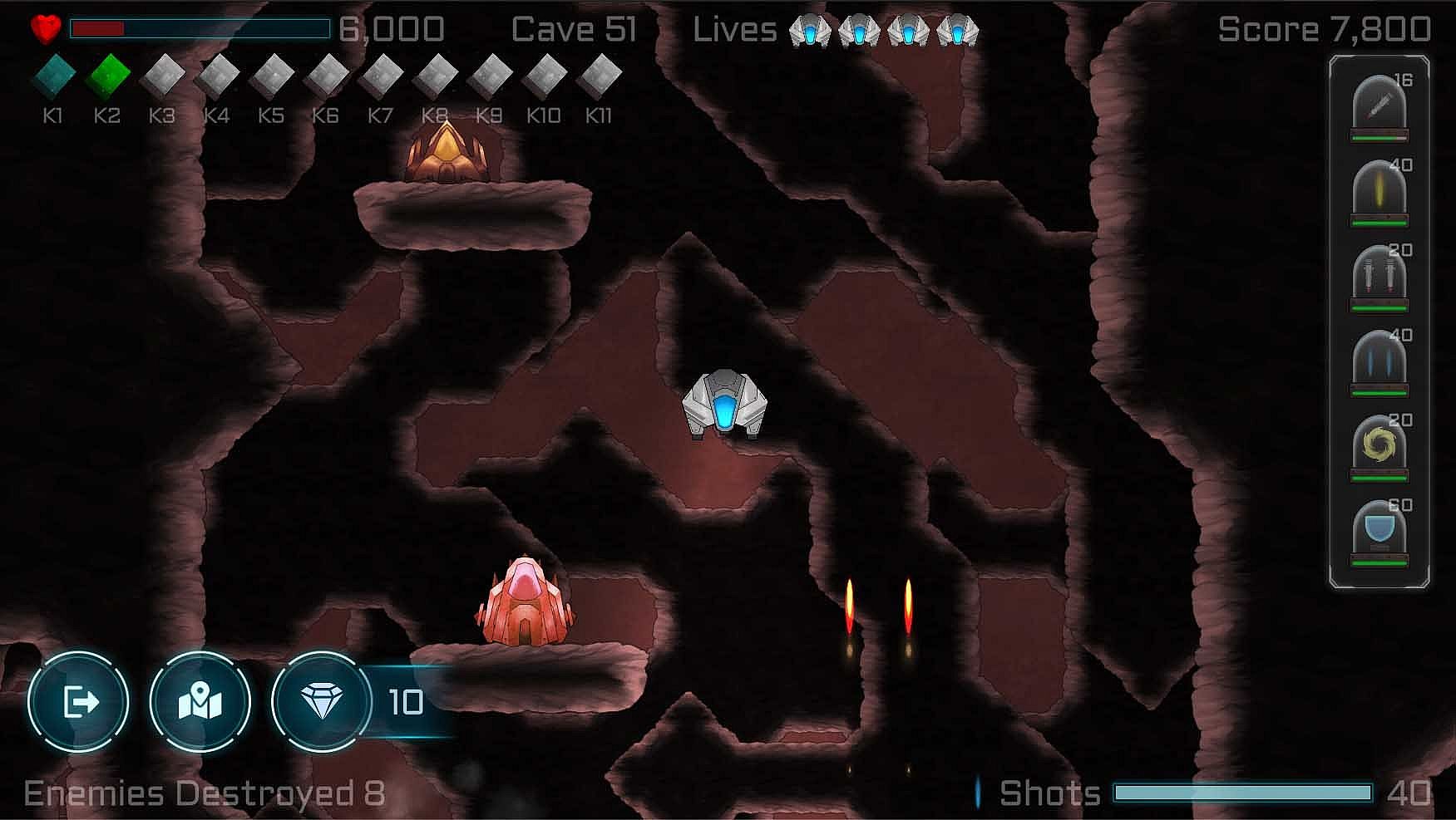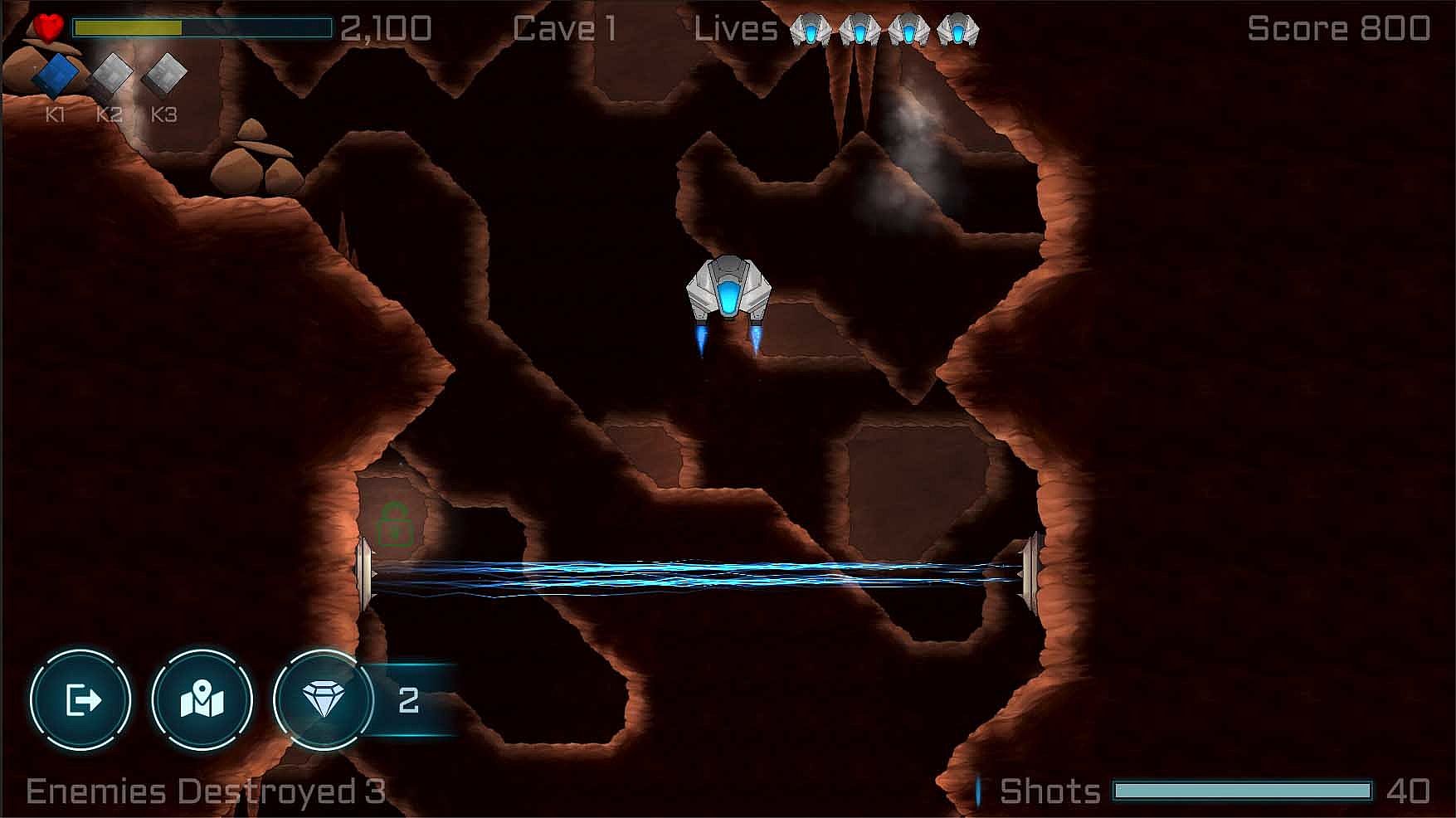 Navigate your spacecraft through these caves, destroy enemies and alien lifeforms and collect as many gems as possible. Collecting gems will increase your health and gain points. You will gain extra bonus points the more gems you collect and enemies you destroy.