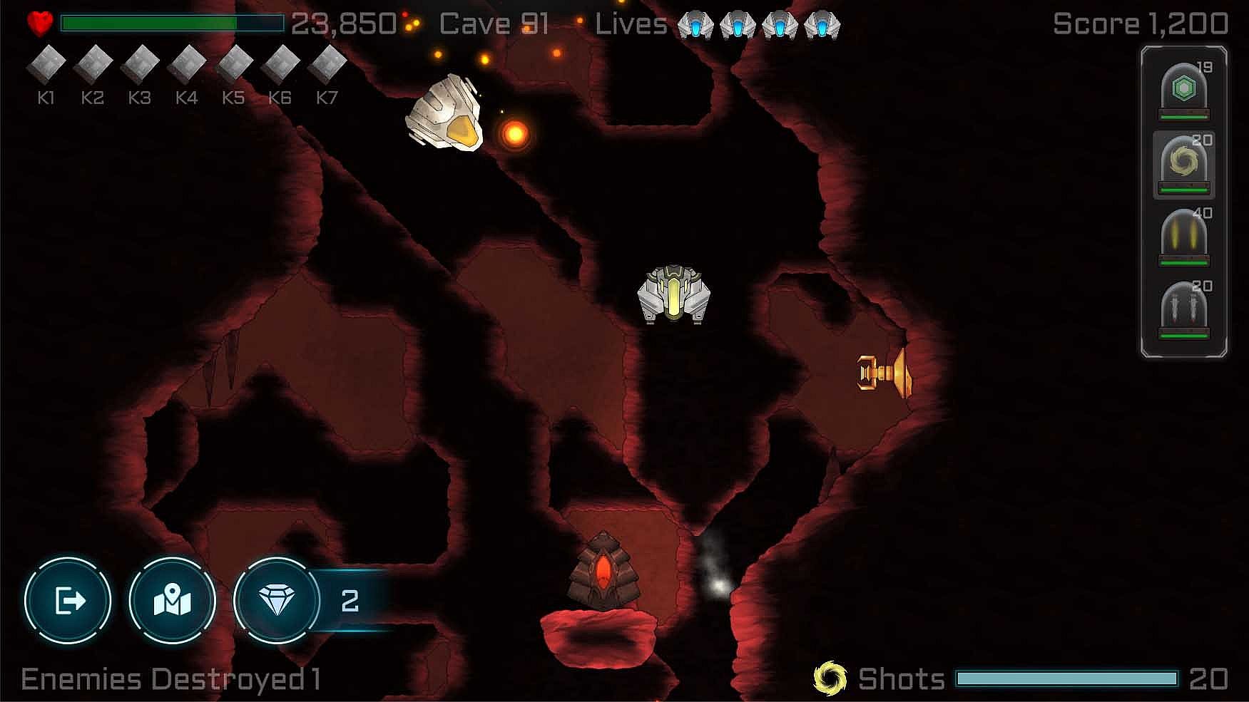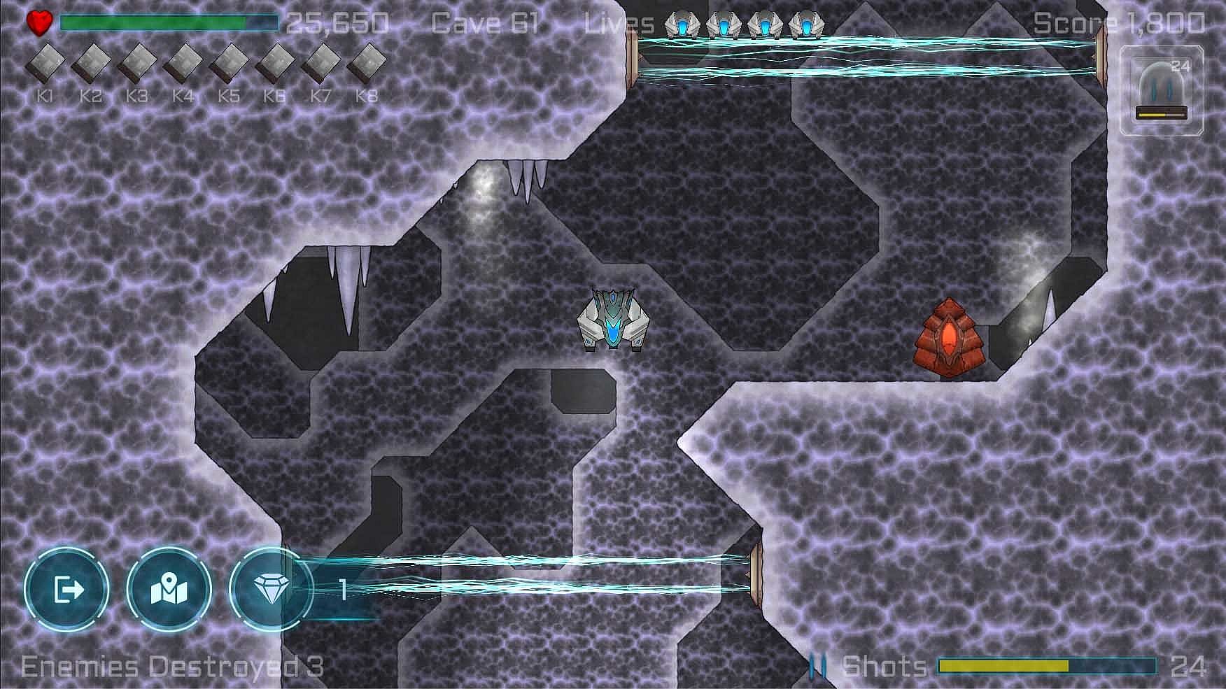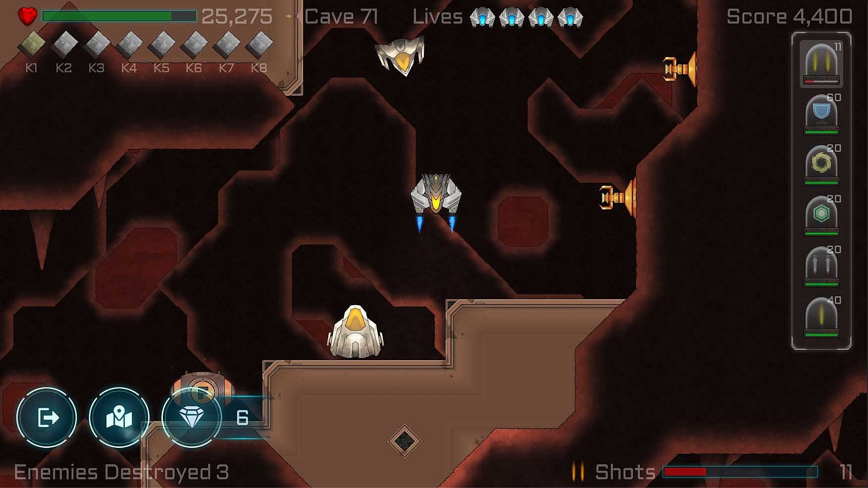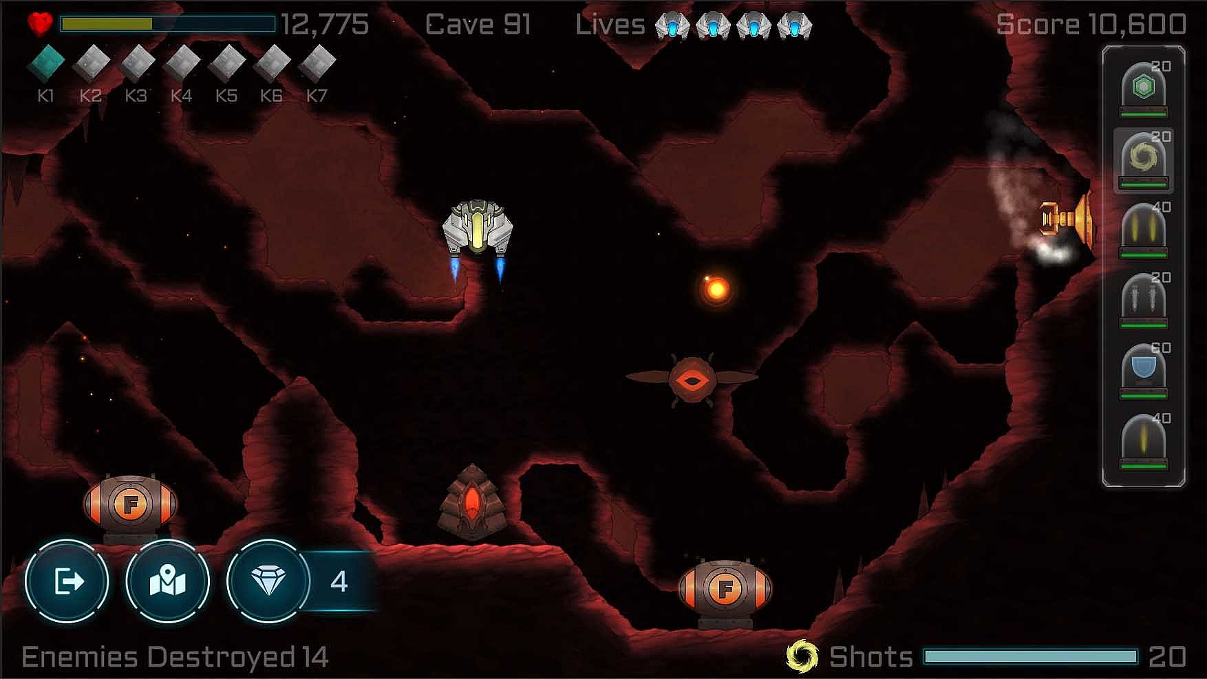 Navigate your spacecraft through these caves, destroy enemies and alien lifeforms and collect as many gems as possible. Collecting gems will increase your health and gain points. You will gain extra bonus points the more gems you collect and enemies you destroy.