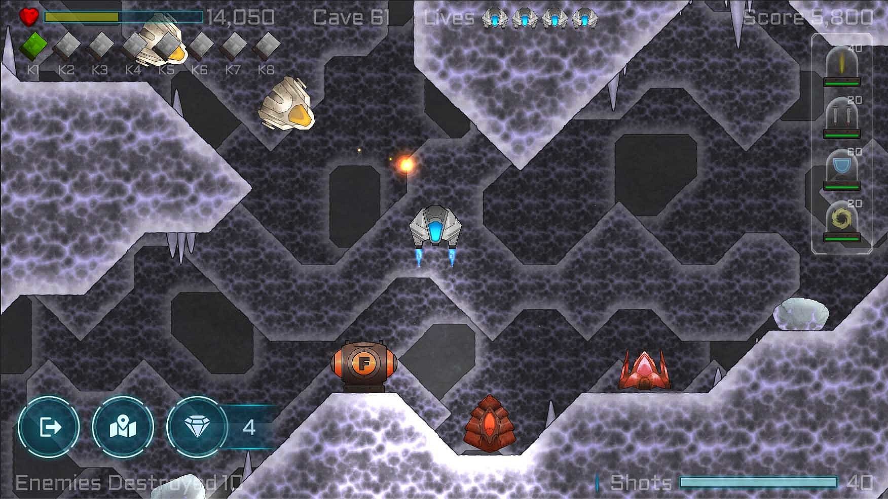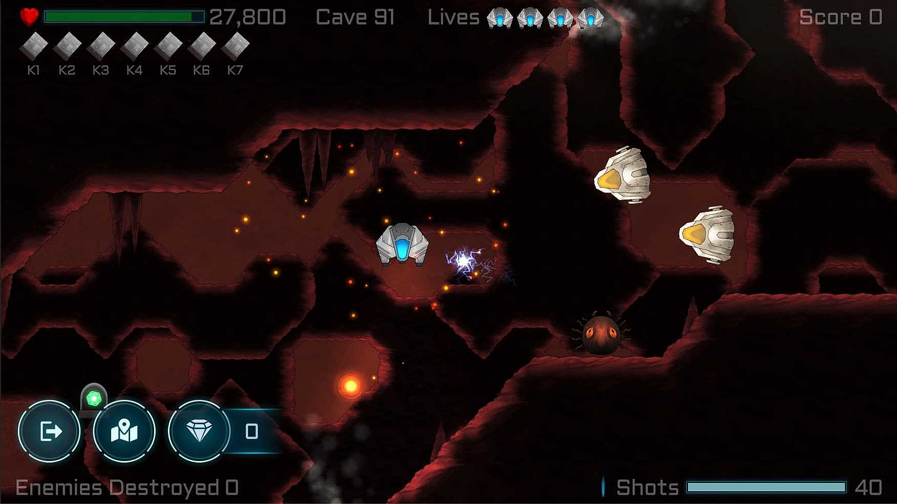 There are 100 cave levels to complete, each one procedurally generated randomly so no two levels are ever the same. As you progress through the levels the caves will become larger, more complex and you will encounter more challenging enemies, aliens and obstacles.