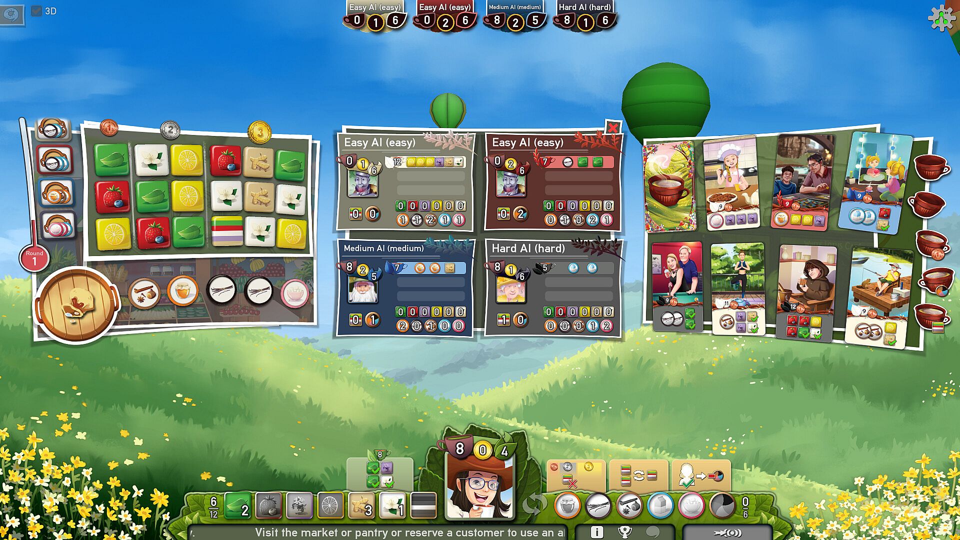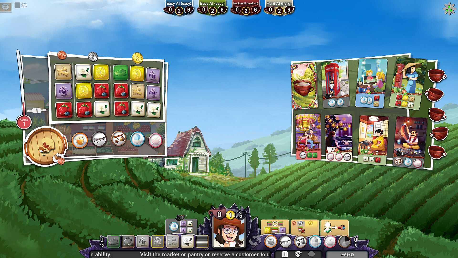 Each turn you can choose to either visit the tea market, the pantry or to reserve a customer and use an ability.