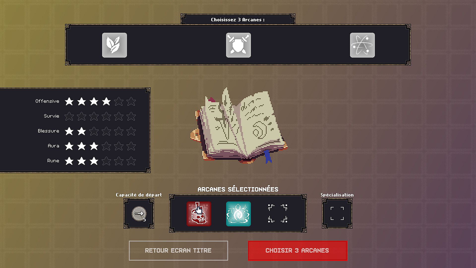 Choose 3 Arcanes from the 5 available.Each Arcane specializes in one aspect of the battle system (Offensiveness, Survival, Wounds, Aura, Runes) and has its own set of associated runes, abilities and talents.