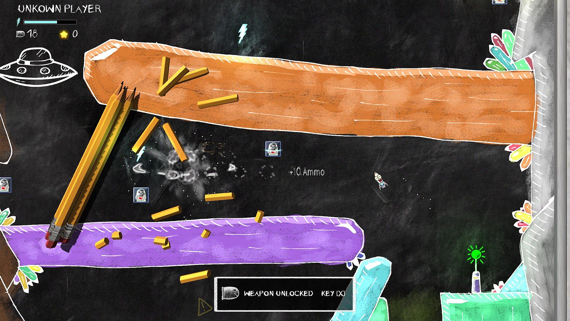 - Hand-drawn environments in a unique chalk art-style.