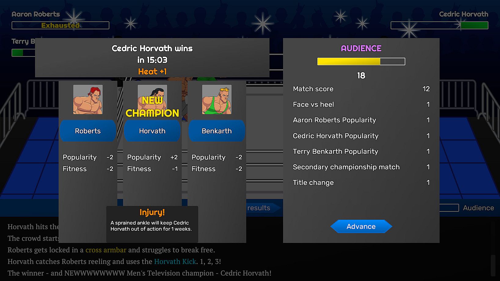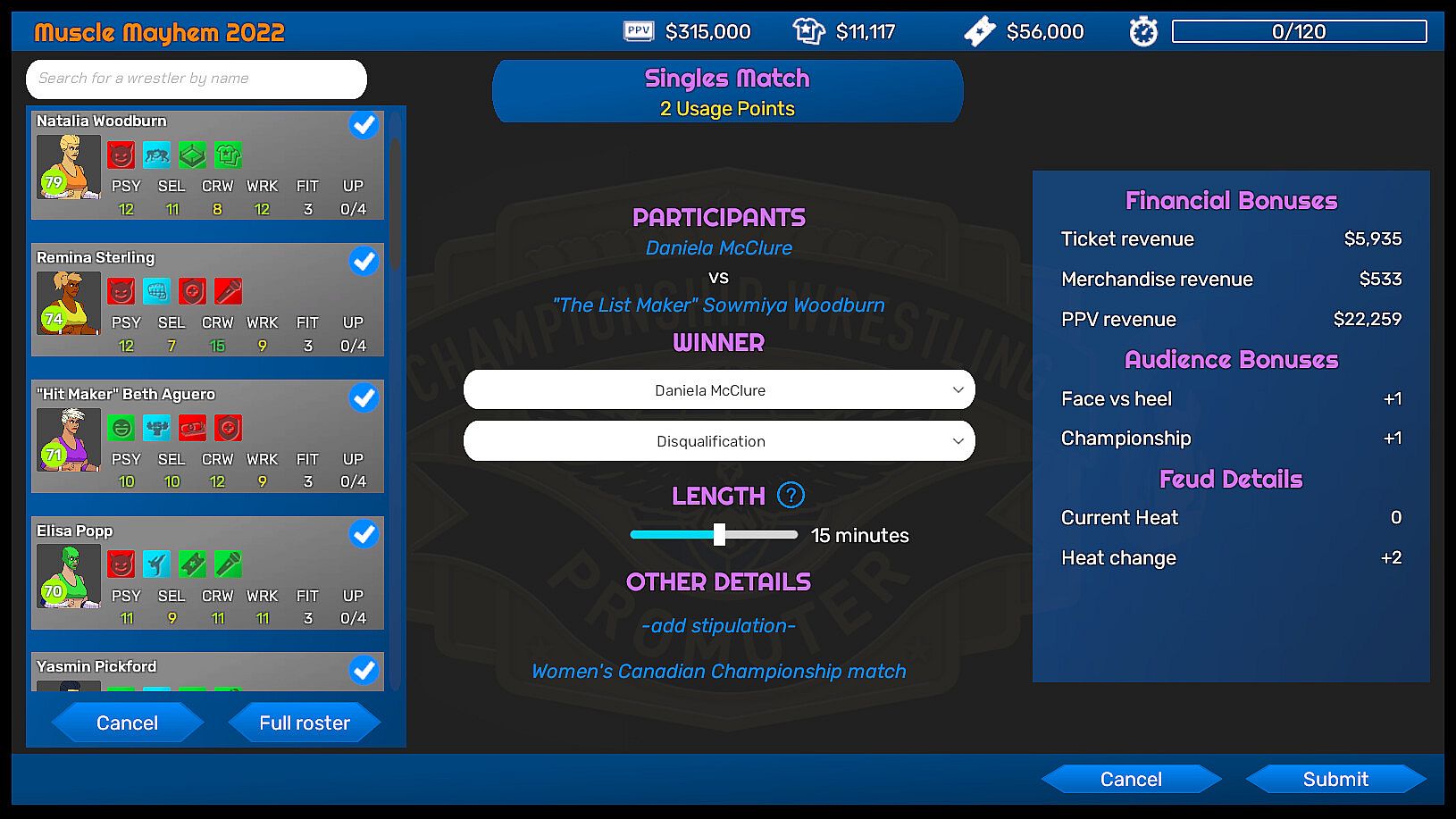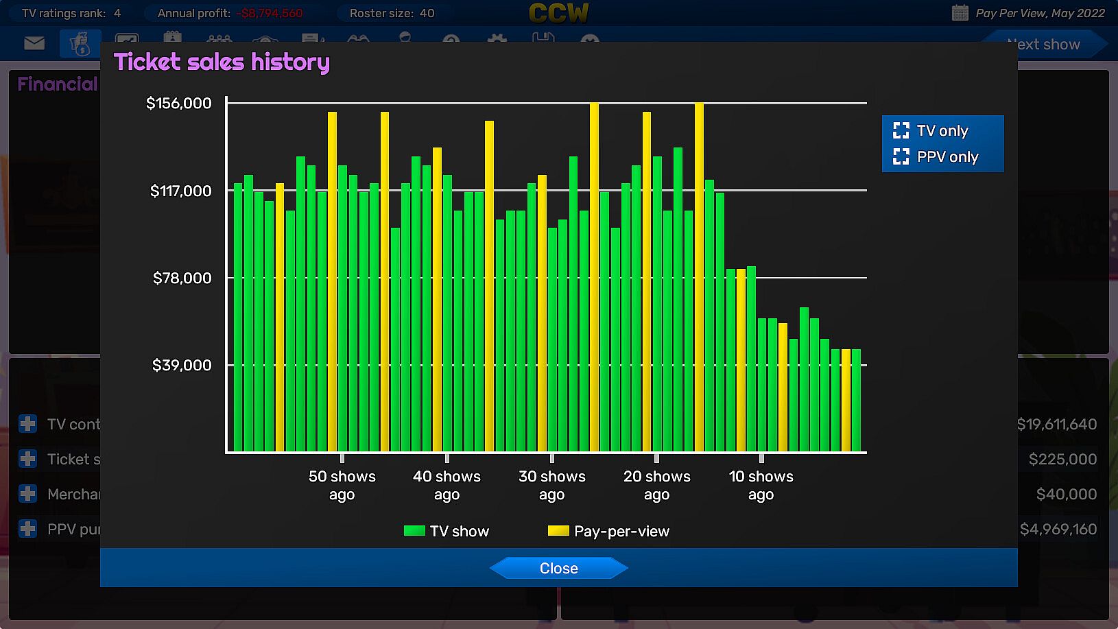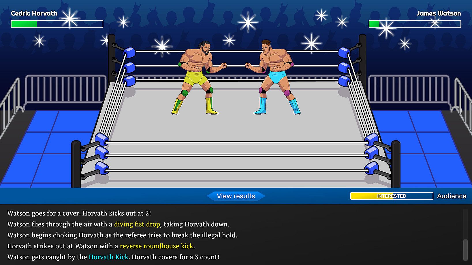 In Championship Wrestling Promoter you run the show from behind the scenes without directly controlling the wrestlers. You'll put together TV shows and pay-per-view events by booking matches and promos to try to get audiences to go wild. But booking shows isn't enough to run a successful promotion, because you'll also have to manage the contracts, morale, and expectations of your wrestlers while making sure the company earns enough revenue to continue operating.