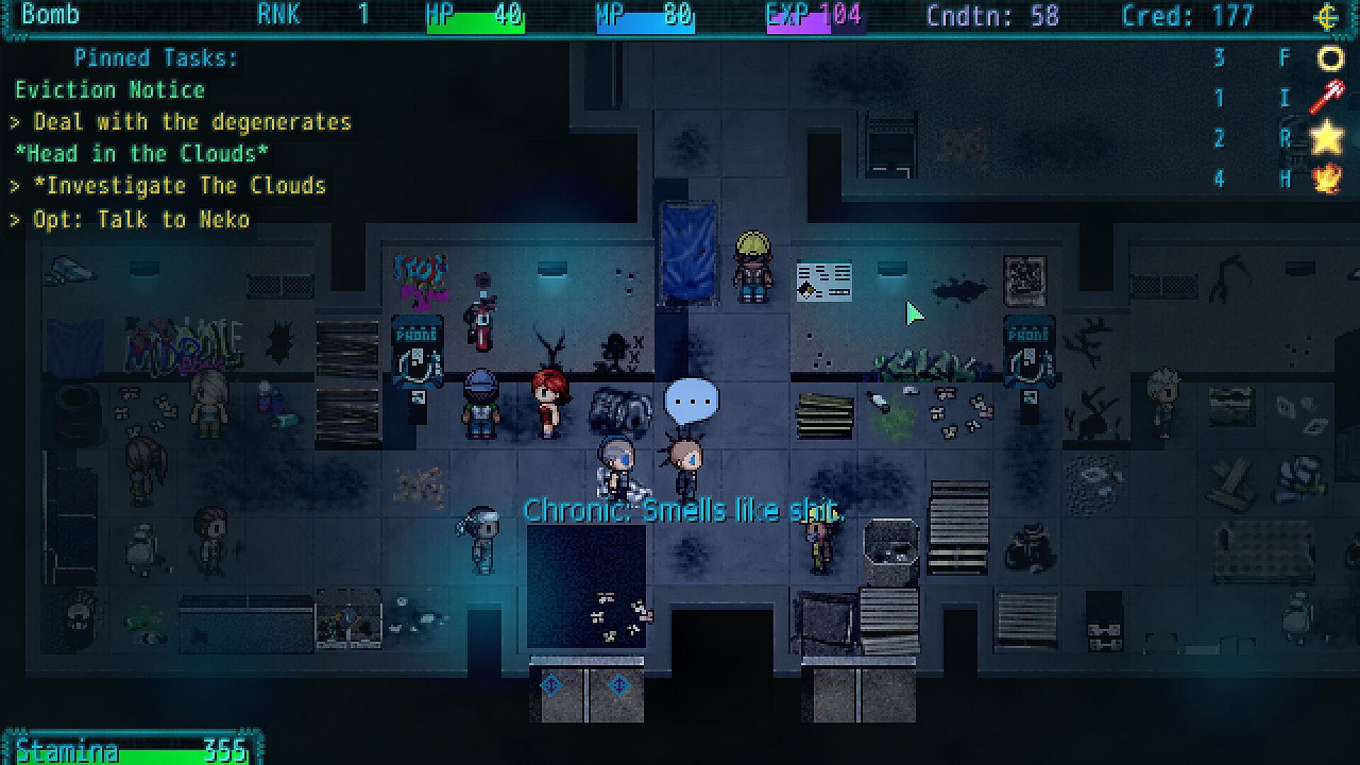 • Bleak atmosphere with original lore, grungy environments, dynamic weather with a day/night cycle, booming techno soundtracks, thousands upon thousands of lines of dialogue and world building, and lots of street slang