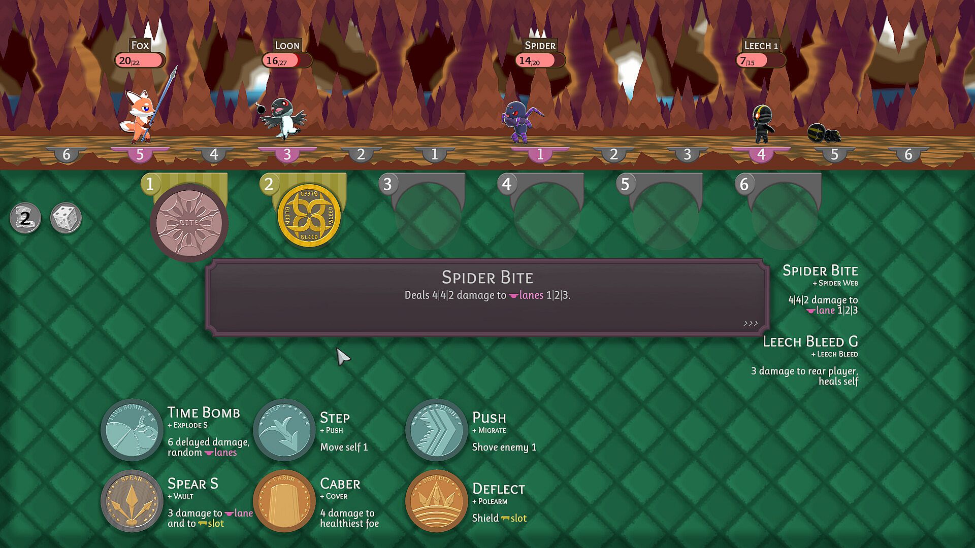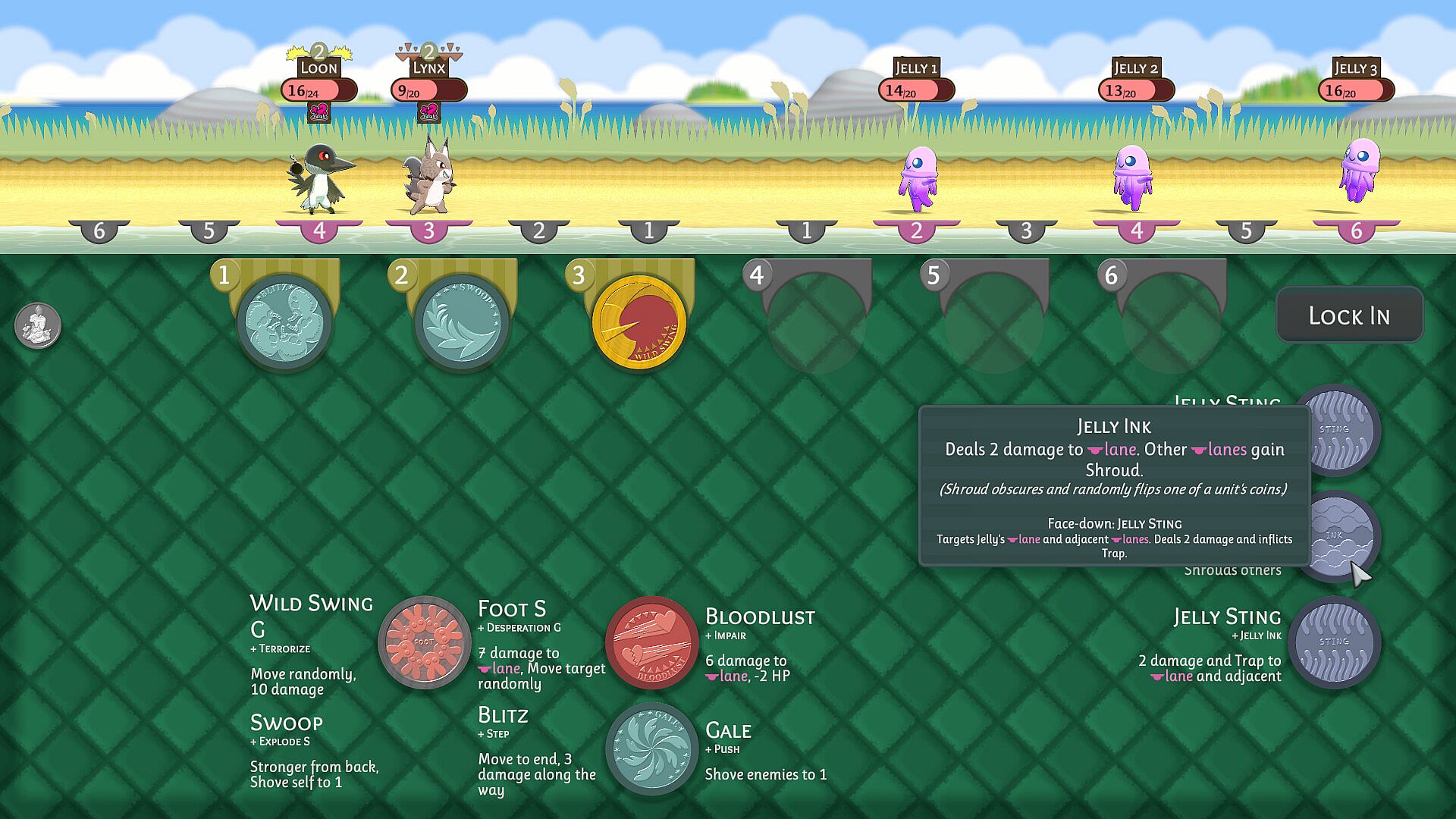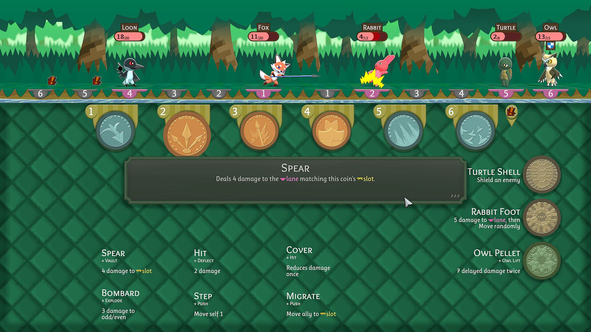 Lane-Based Tactics | Different coins target different lanes, based on their user's position or the coin's order in the turn. Manipulate player and enemy unit positions as well as coin order to optimize each coin's effectiveness.