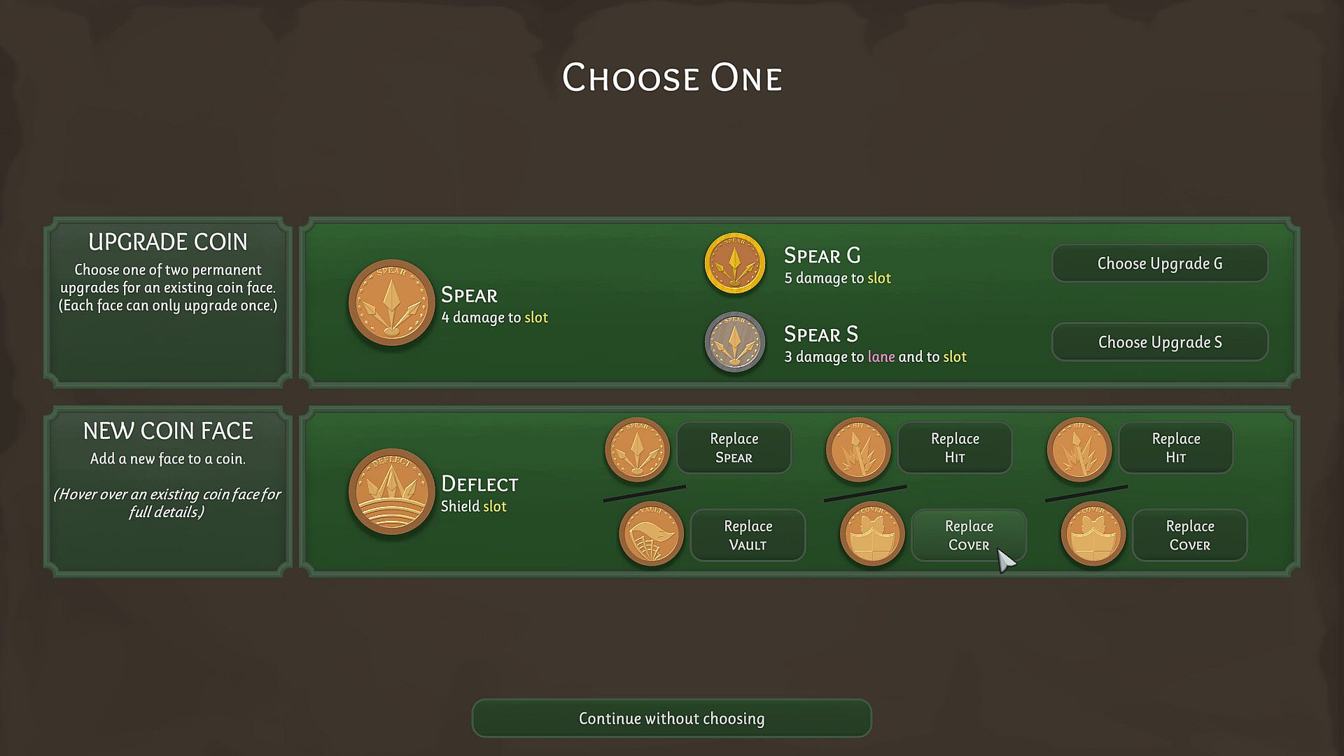 Coin Building | Each side of every coin has a different action. Find new coin faces from combat rewards and non-combat events to replace old actions with stronger ones.