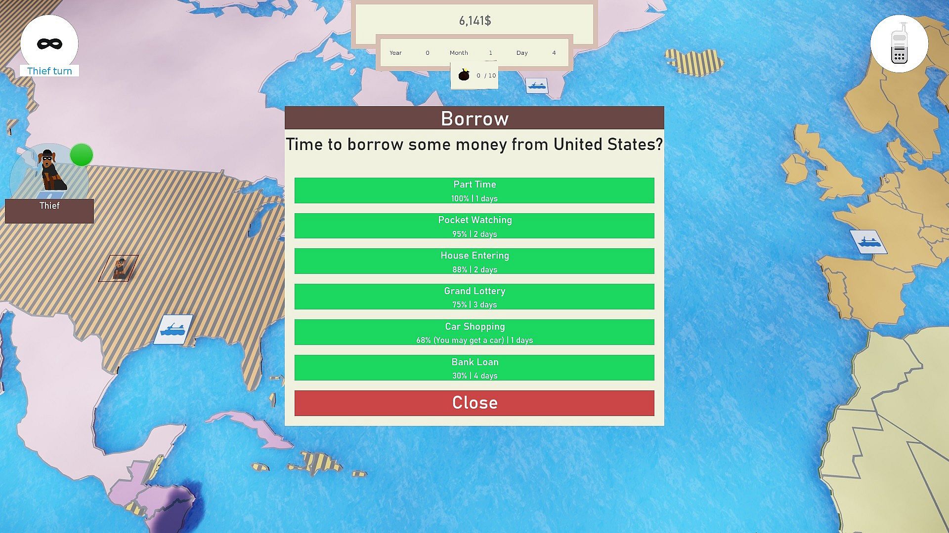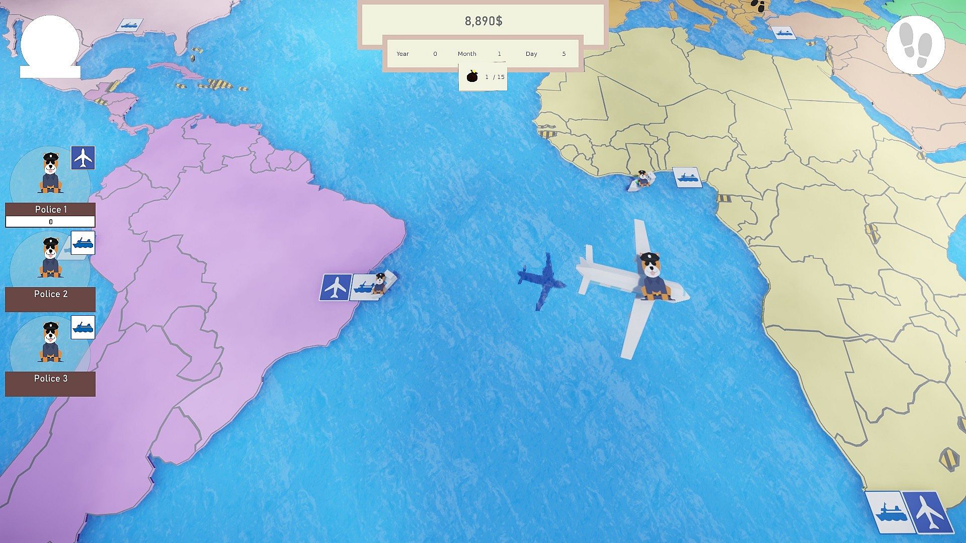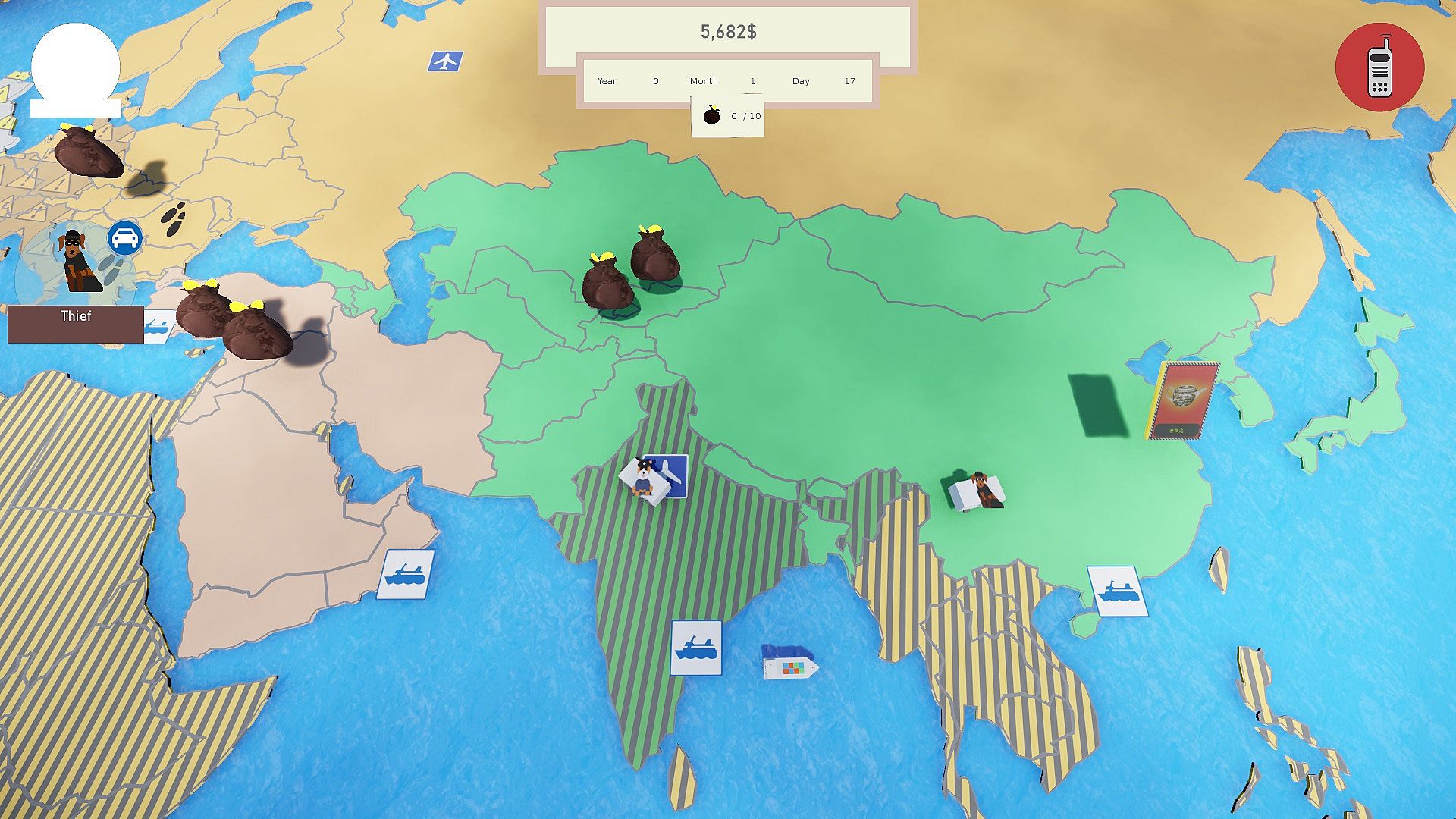 Collecting money bags while trying to avoid the police. Choose your countries wisely, if the police use it´s scanner and you are inside the borders of the same or a neighboring country, you get caught!