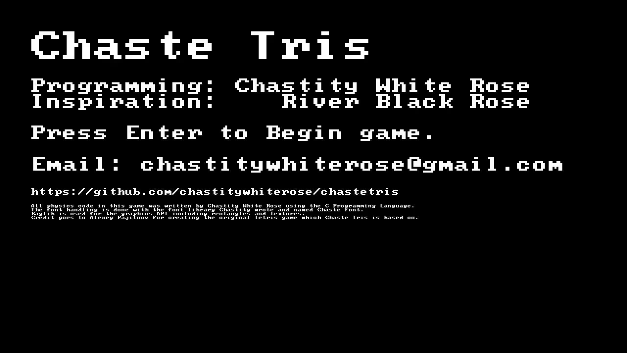 Chaste Tris is my first complete video game I have made. It is based on Tetris but there is no gravity. Blocks can be freely moved up, down, left, and right with the arrow keys. They can be rotated with X or Y keys and can also be held for later use with C. The space bar or H key can also be used to hard drop the blocks!