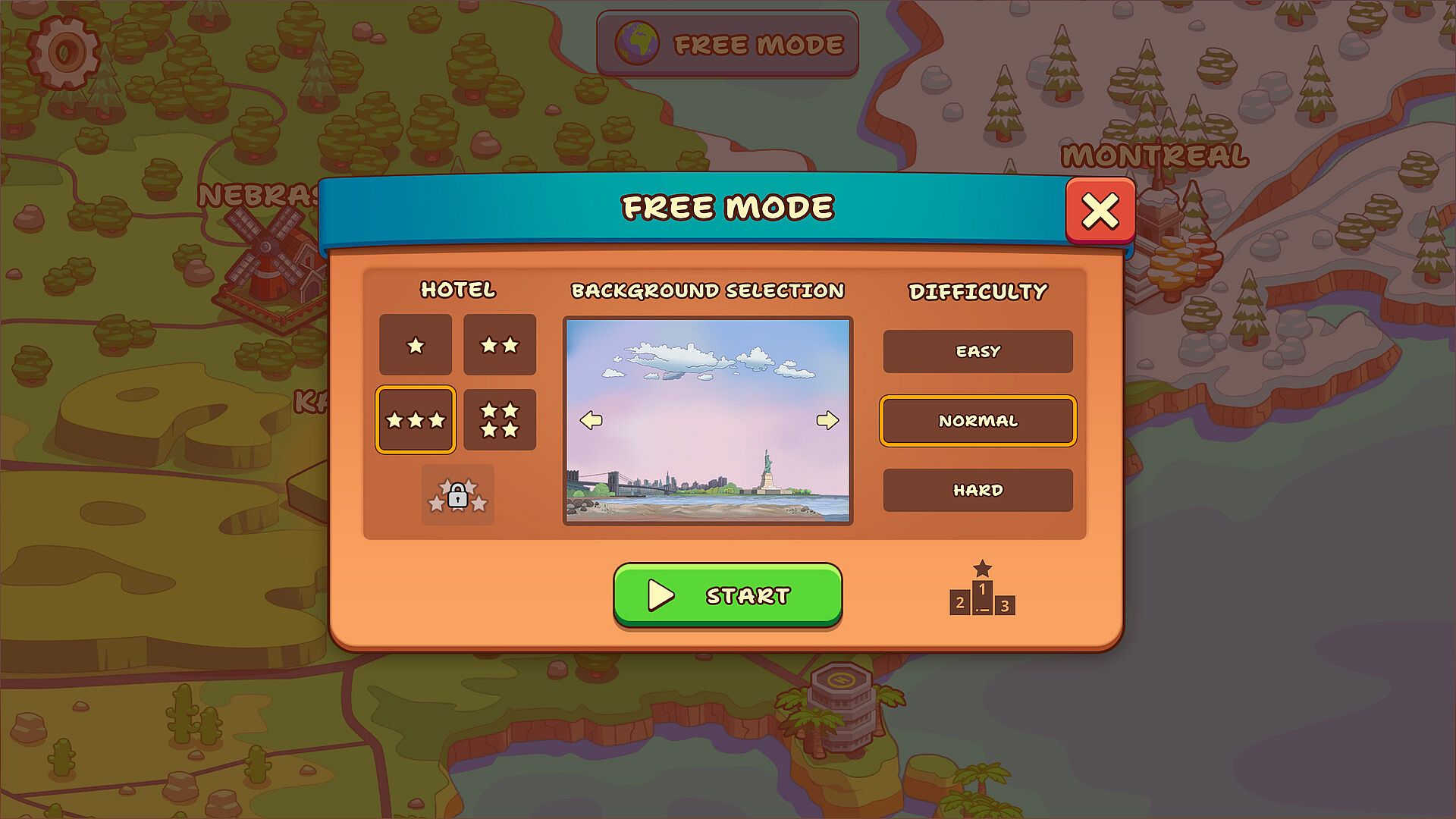 Guests do not want to settle anywhere - they demand a hotel of a certain star rating and a room that suits them. And they won't wait forever, they only have limited patience! Try to serve everyone in order to earn as much as possible and expand your hotel chain.