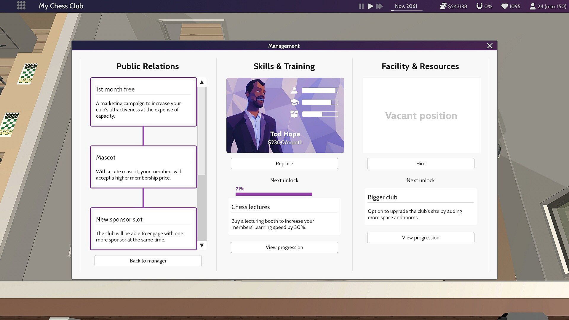 In this management game, build the ultimate chess club and achieve worldwide fame.