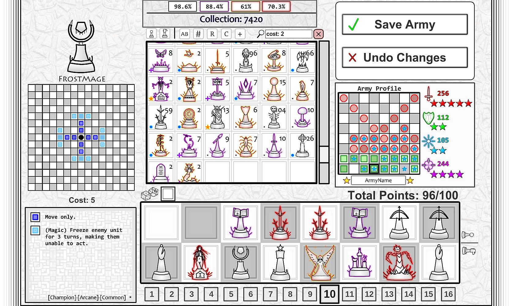Collect chess pieces and build custom armies to outmaneuver opponents in live multiplayer PvP matches. Play ranked games, practice sessions, daily PvE challenges, or local two-player bouts with over 500 units featuring melee, ranged, magic, passives, and triggers. Every matchup stays deterministic with zero RNG, rewarding sharp strategy, tactics, skill, and precision across unfathomable army combinations. This free-to-play strategy game on PC accelerates learning through smart visual systems while keeping art focused on clear utility. It offers an easy entry point with a vast skill ceiling, dynamic synergies, and ongoing solo-developer updates via community feedback. Players who crave pure tactical depth without luck interference will find endless depth here.