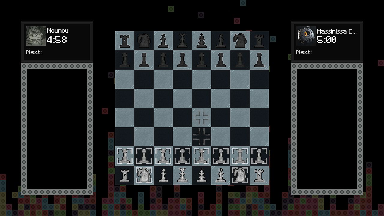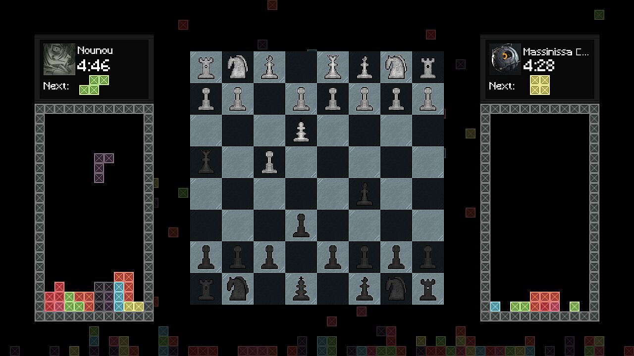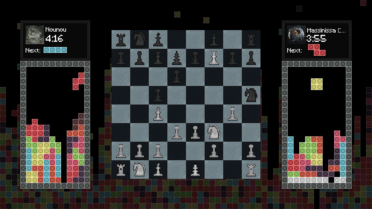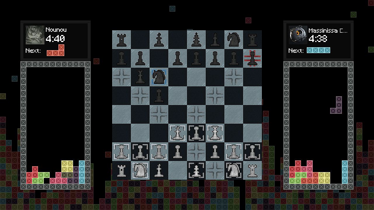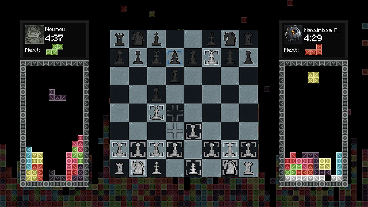 Two players battle in a fast-paced blitz chess match on PC, each with five minutes to complete all moves. A timer ticks down on your turn, and failure to move in time ends the game. Right after the opening chess move, Tetris pieces begin falling on both sides, where losing at either game spells defeat. Capturing an opponent's chess piece spawns a line at the bottom of their Tetris board to raise the difficulty. Clearing three lines in your Tetris adds two to theirs, while a four-line Tetris adds three. This indie free-to-play fusion demands sharp focus across both challenges, perfect for players who crave split-attention strategy showdowns.