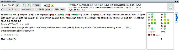 :However, the interpretation of an engine variation in natural language is groundbreakingly new. It is often a challenge for many players to imagine what is actually happening based on just an engine variation. You see the best move, the rating, and that's it. ChessBase 17 describes in words what the variation entailsFor example: In a super-sharp position, a complex variation has the strange rating "0.00". ChessBase 17 would then add "perpetual check" or "repetition of the position" and the situation would become clear. Material changes are vividly described: "White wins the queen for rook and knight"; "Black loses two pawns"; and even "The position is simplified into an endgame R+B vs R+N". There are also exciting statements like: "White gains a dangerous passed pawn on e6"; or "White sacrifices a bishop"; "Black has an attack"; "White gets the majority on the kingside"; "Both kings are insecure"; and "Manoeuvre Nd2-f1-e3-d5" etc.