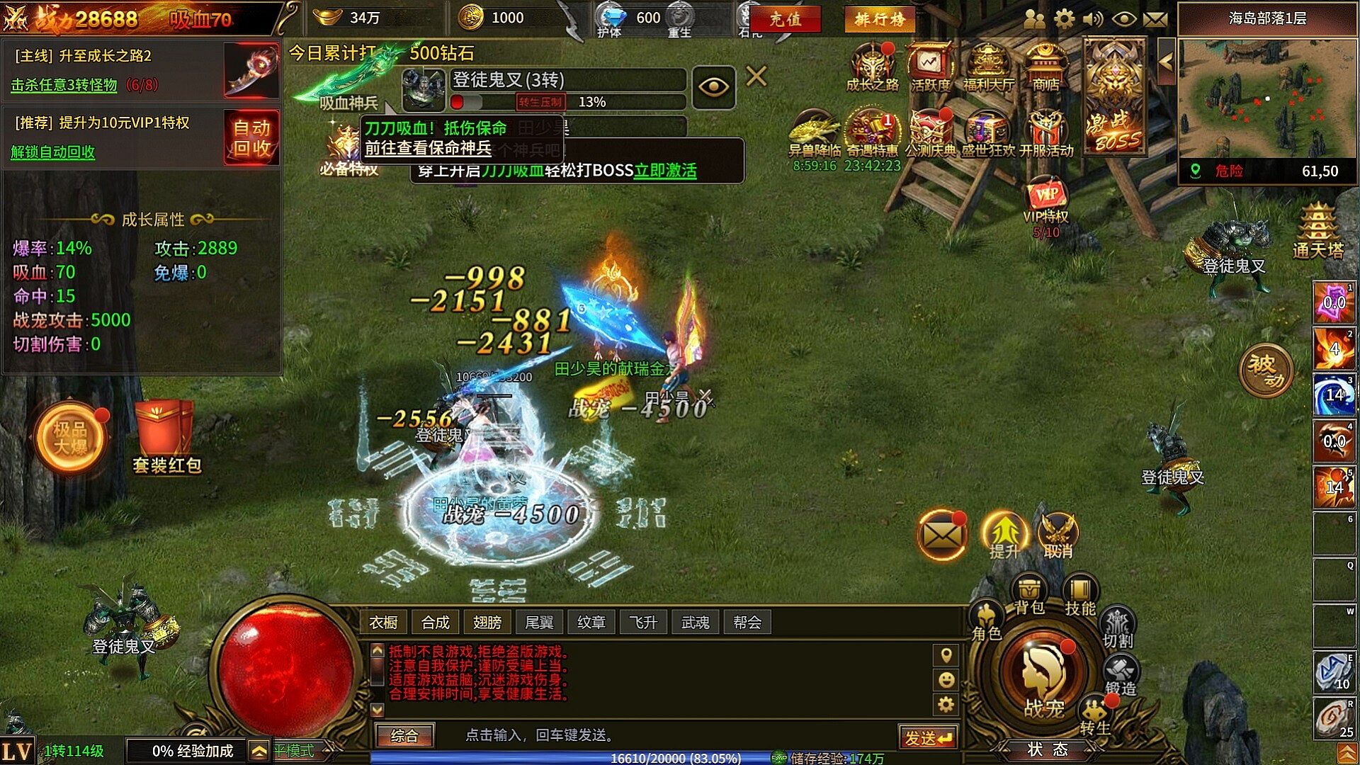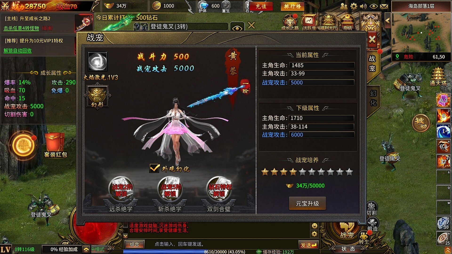 2)战宠升级可以获得更高的攻击力和更酷炫的战宠外形;而且战宠可以通过道具强化增加攻击和石化效果,更可以范围输出首领。