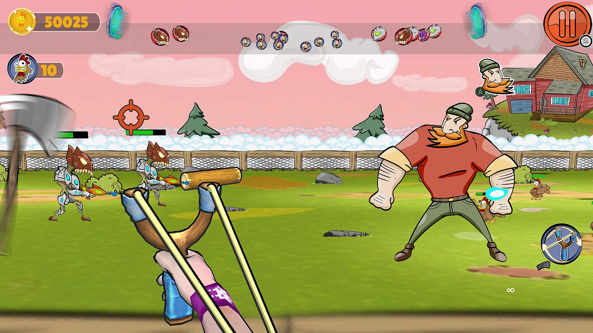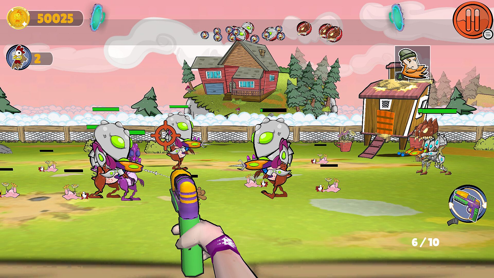 In Chicken Coop Invaders, the core loop revolves around defending chicken coops from waves of alien attackers in an FPS framework enhanced by tower defense features. You move through ranch environments, wielding weapons to shoot down enemies while setting up defenses to protect the birds. Mechanics include making allies who assist in combat, buying items from a shop system, and upgrading gear to handle tougher threats. The action stays intense with direct confrontations against varied foes, requiring you to balance shooting accuracy with strategic placement of towers or barriers.
