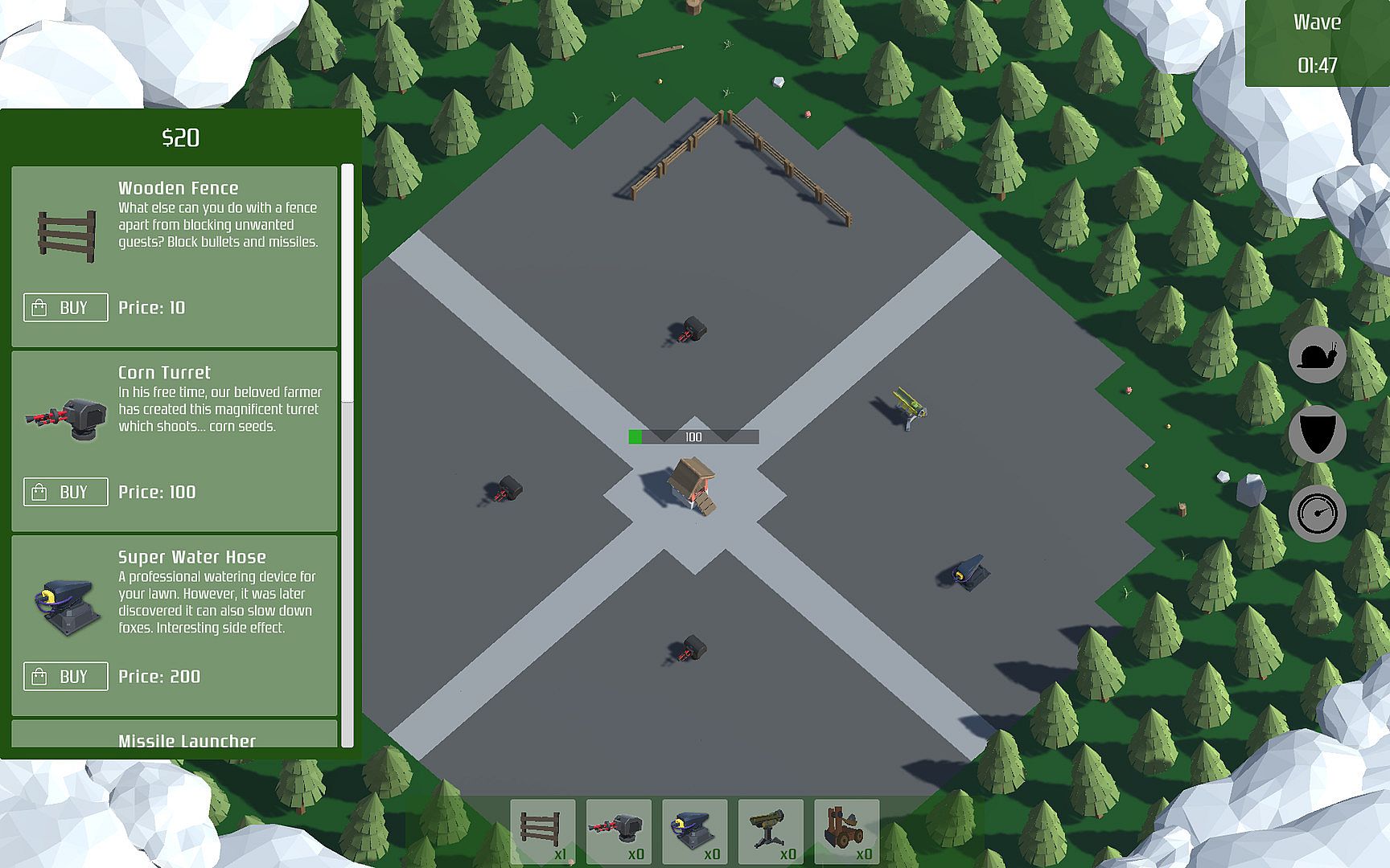 Before each wave there is a building phase when you can prepare for what's coming next. You can choose between 5 items and 3 power-ups which might help you to achieve your goal. The items can be placed on the map and have different properties: