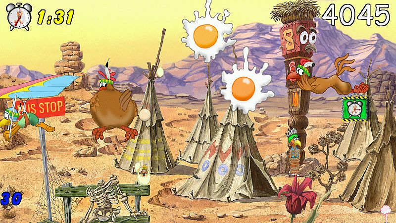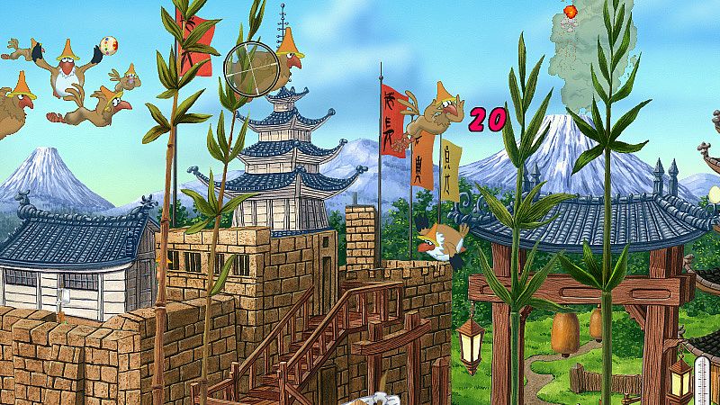 Stop rampaging roosters from causing chaos in this classic fun shooter packed with adventure elements. Players blast away chickens across Arcade mode or race the clock in Classic mode, tackling three difficulty levels that ramp up the challenge. Collect items and rack up extra points through varied actions, while unique level gimmicks keep missions fresh. Over 25,000 hand-drawn chicken animations bring comic flair to six landscapes in one part and seven in the other, paired with six weapons of different ranges. Enjoy single-player pursuits with online high scores or team up to four players via LAN or Internet multiplayer. Families and hardcore gamers alike find hours of casual action in the hilarious poultry battles.