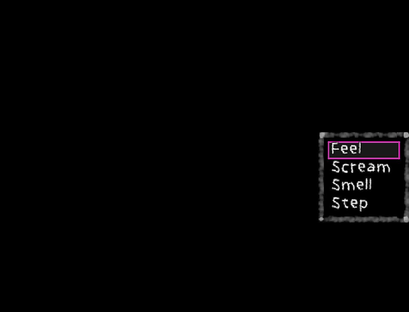 When you lose your most valuable senses, a combination of the rest has to do. Feel, scream, smell, and manage. The game uses a variety of senses to aid the player throughout their journey. Feel: You feel around your surroundings in order to gather information from your current location. Smell: smell the surrounding environment in order to get a good indication of what kind of challenges may lay ahead. Scream: Scream out loud in order to deter your foes as well as draw attention from other NPCs. Step: Forwards, Backwards, Left, Right.