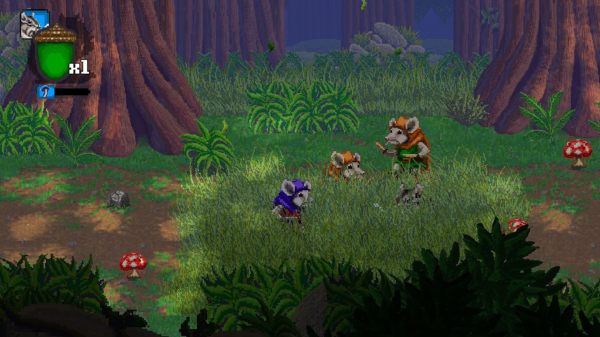 The gluttonous gray squirrel has stolen all the land's food stores, threatening the forest’s inhabitants with starvation. Embark on a perilous journey as a chipmunk martial arts master — Grey, Cheeks or Red — as you battle a multitude of foes in a heroic attempt to recover the stolen food.