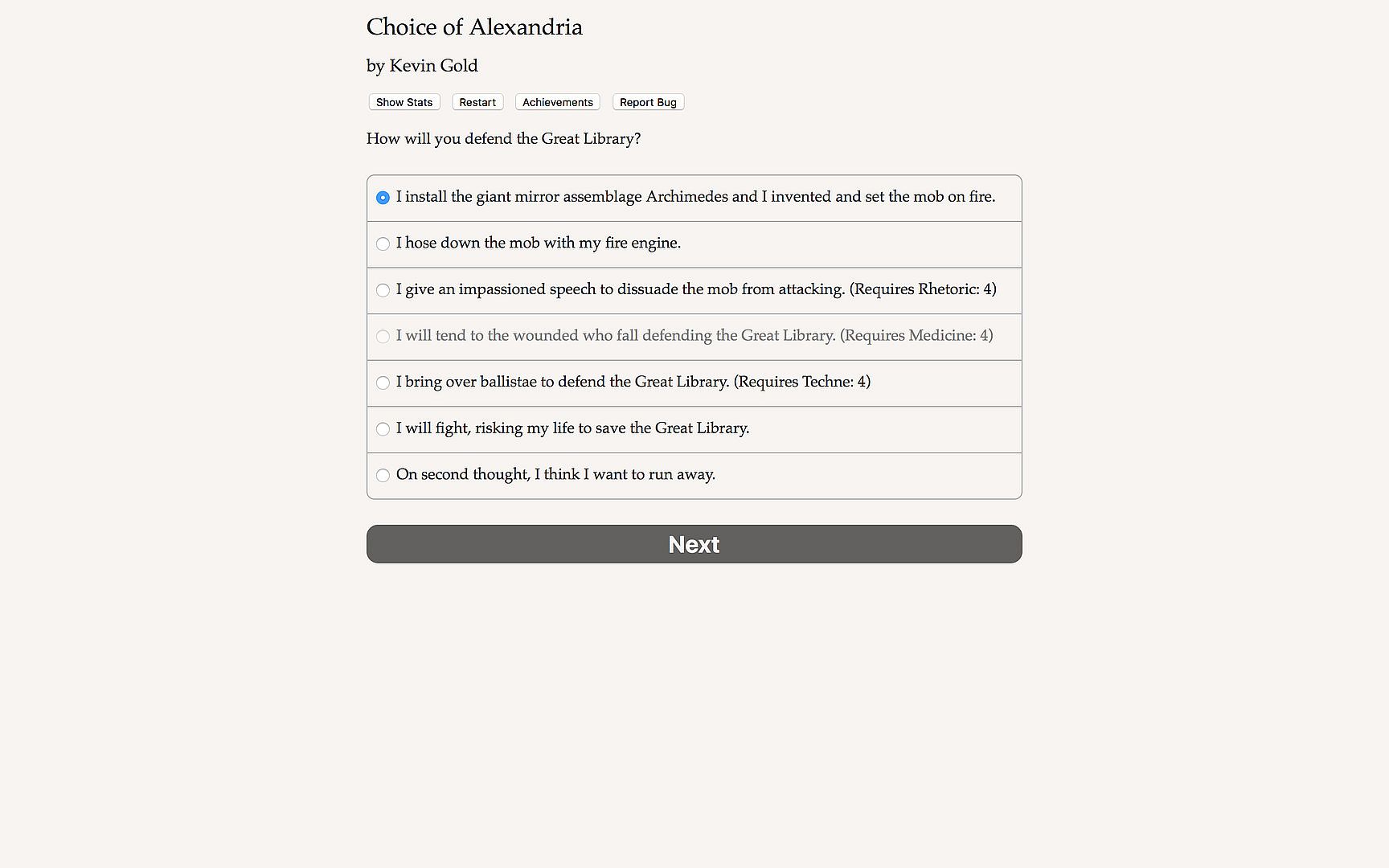 "Choice of Alexandria" is an interactive novella by Kevin Gold, author of "Choice of Robots." Your choices control the story. It's entirely text-based--90,000 words, without graphics or sound effects--and fueled by the vast, unstoppable power of your imagination.