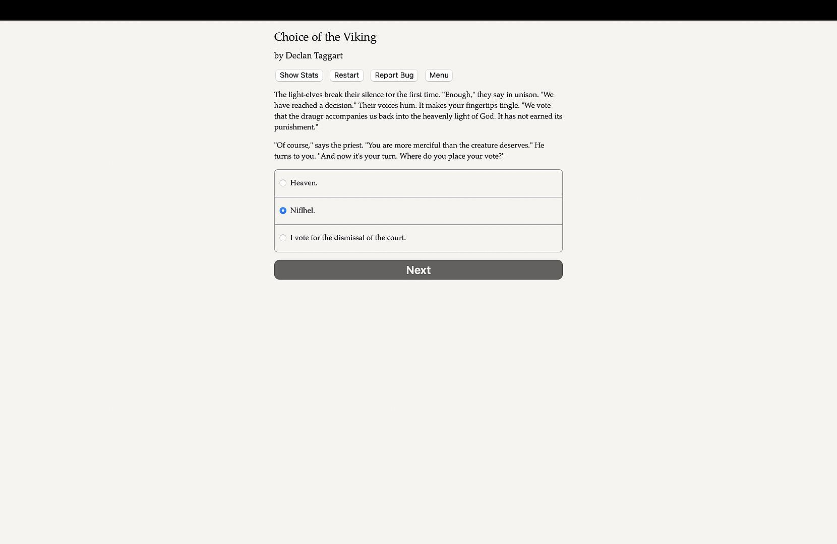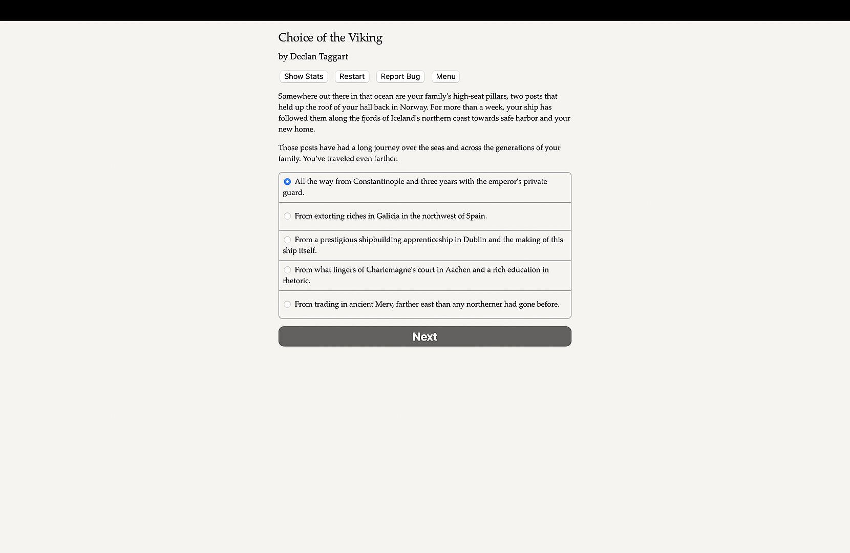 Choice of the Viking is a 306,000 word interactive historical fantasy novel by Declan Taggart, where your choices control the story. It's entirely text-based—without graphics or sound effects—and fueled by the vast, unstoppable power of your imagination.