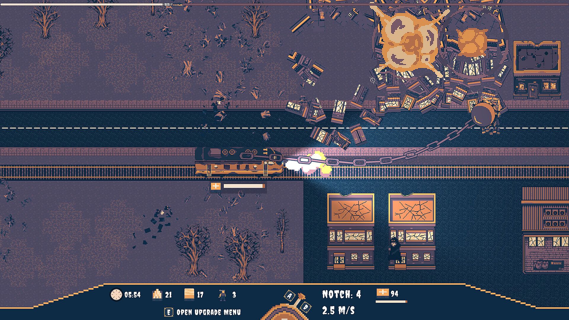 The environment is fully destructible! Level buildings to reduce zombie spawns and clear your path to victory! Your main resources are gold, steel, and survivors, all crucial for upgrading your train. Gold can be found in crates and buildings like tombs, cabins, supermarkets, and police stations. Steel comes from metal objects such as cars, camper vans, and reinforced structures. Survivors are hidden in safe houses, and their numbers vary with each run, making every playthrough unpredictable and strategic.