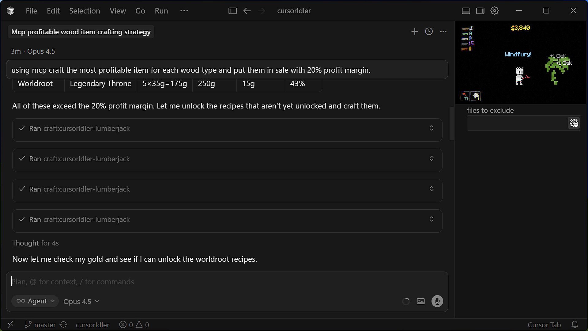 Every action; upgrading your axe, selling to market offers, accepting customer deals, crafting items can be controlled through MCP. Your AI agent can manage your economy while you review its code