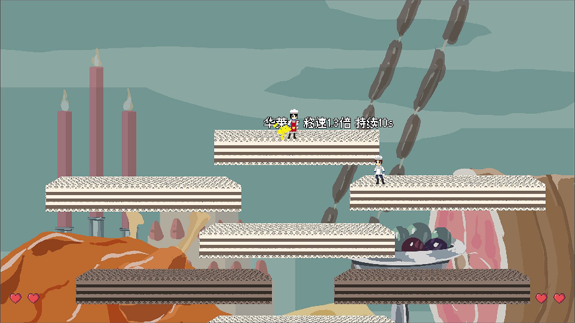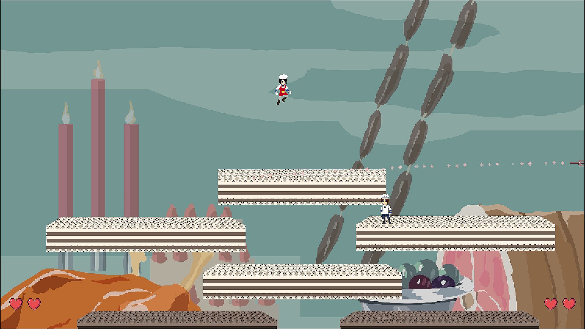 This is a classic 2D platform action jumping and shooting PVP game, requires two players. Player 1 and Player 2 play as two little chefs, maneuvering between floating platforms, moving up and down, and throwing various food and utensils at each other to knock the opponent off the platform.