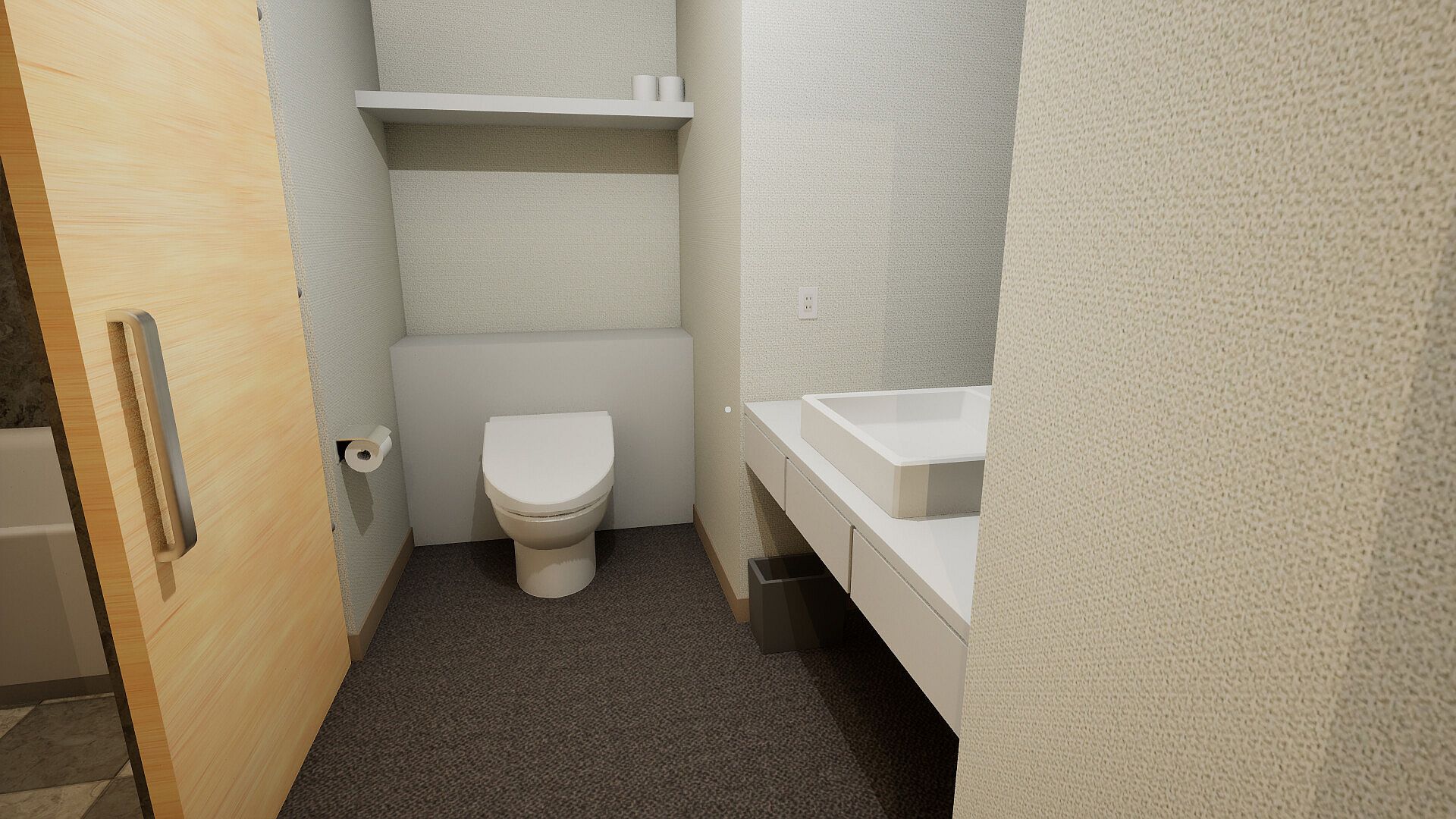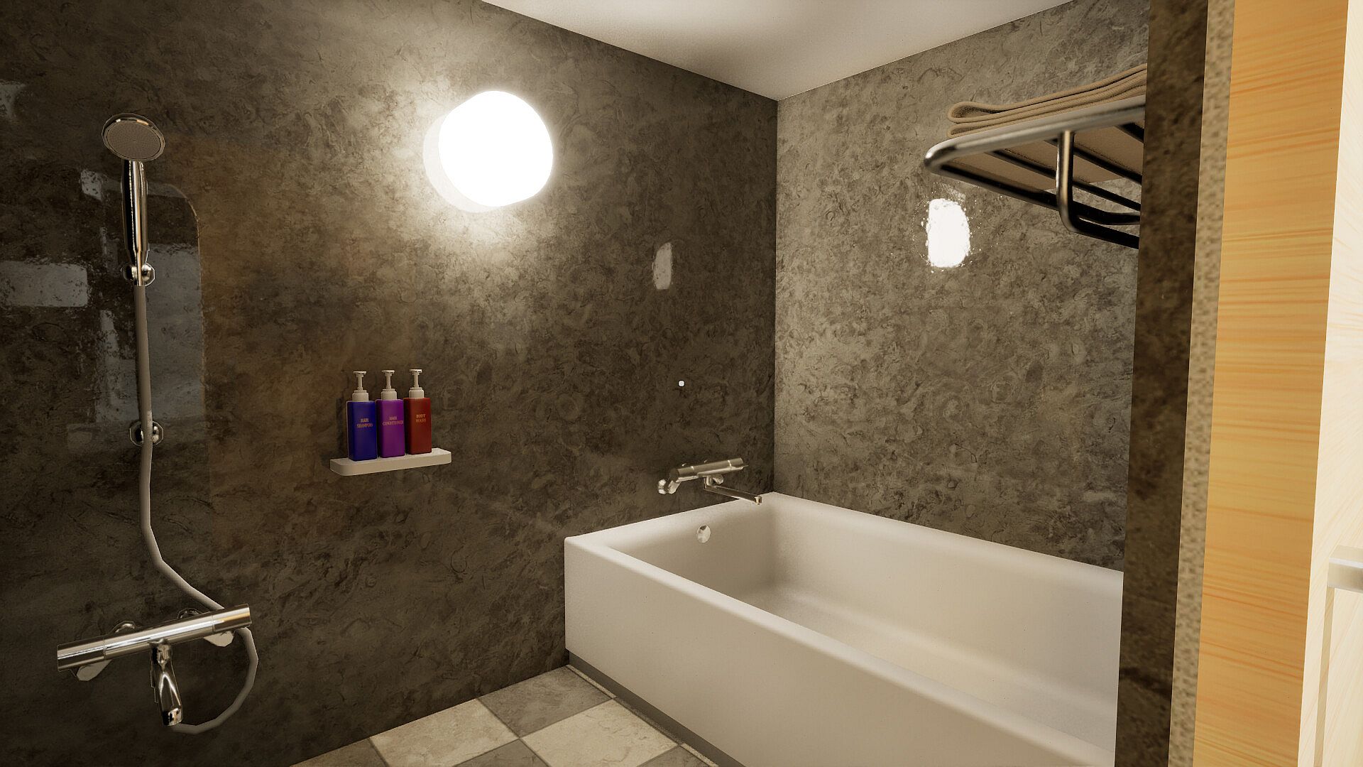 You check in and the room you enter is a normal business hotel room with a bathroom and a bed.