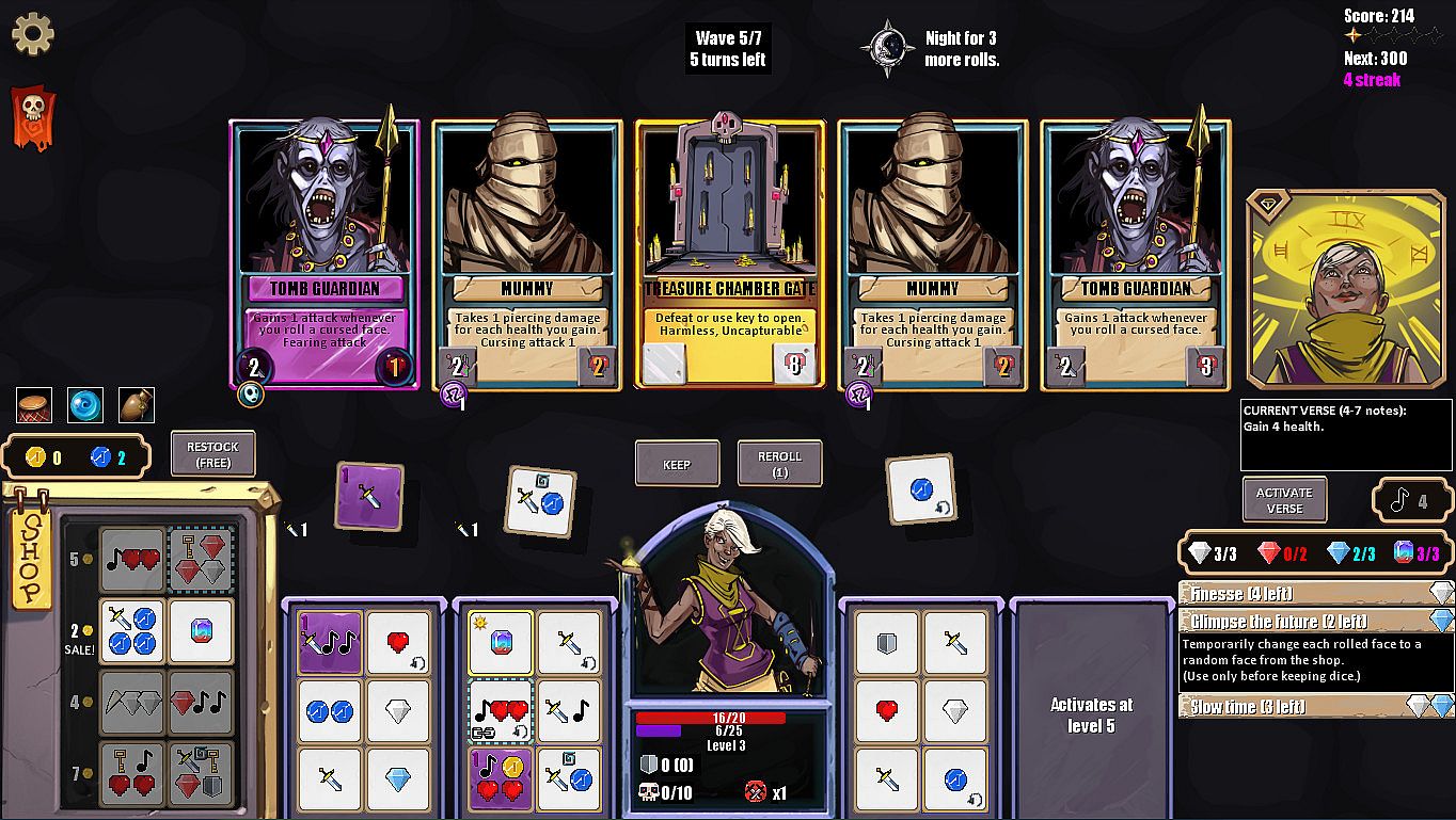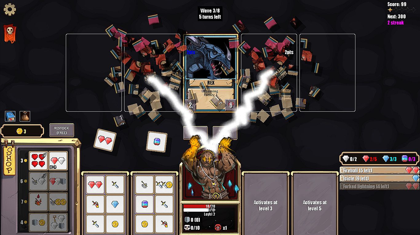 • A game about probability manipulation and combo crafting: shape 6-sided dice into weapons of destruction, generators of wealth, magic conduits, or stat-boosting machines!