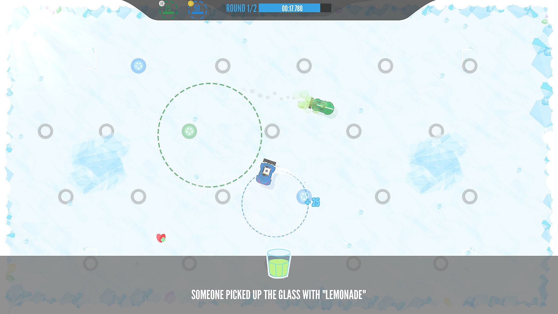 This mini game is like Classic, but slightly more skill-based. Color as much wheels as you can by doing donuts around them. Don't stop defending your previously colored wheels, because your opponents can steal points from you by re-coloring them.