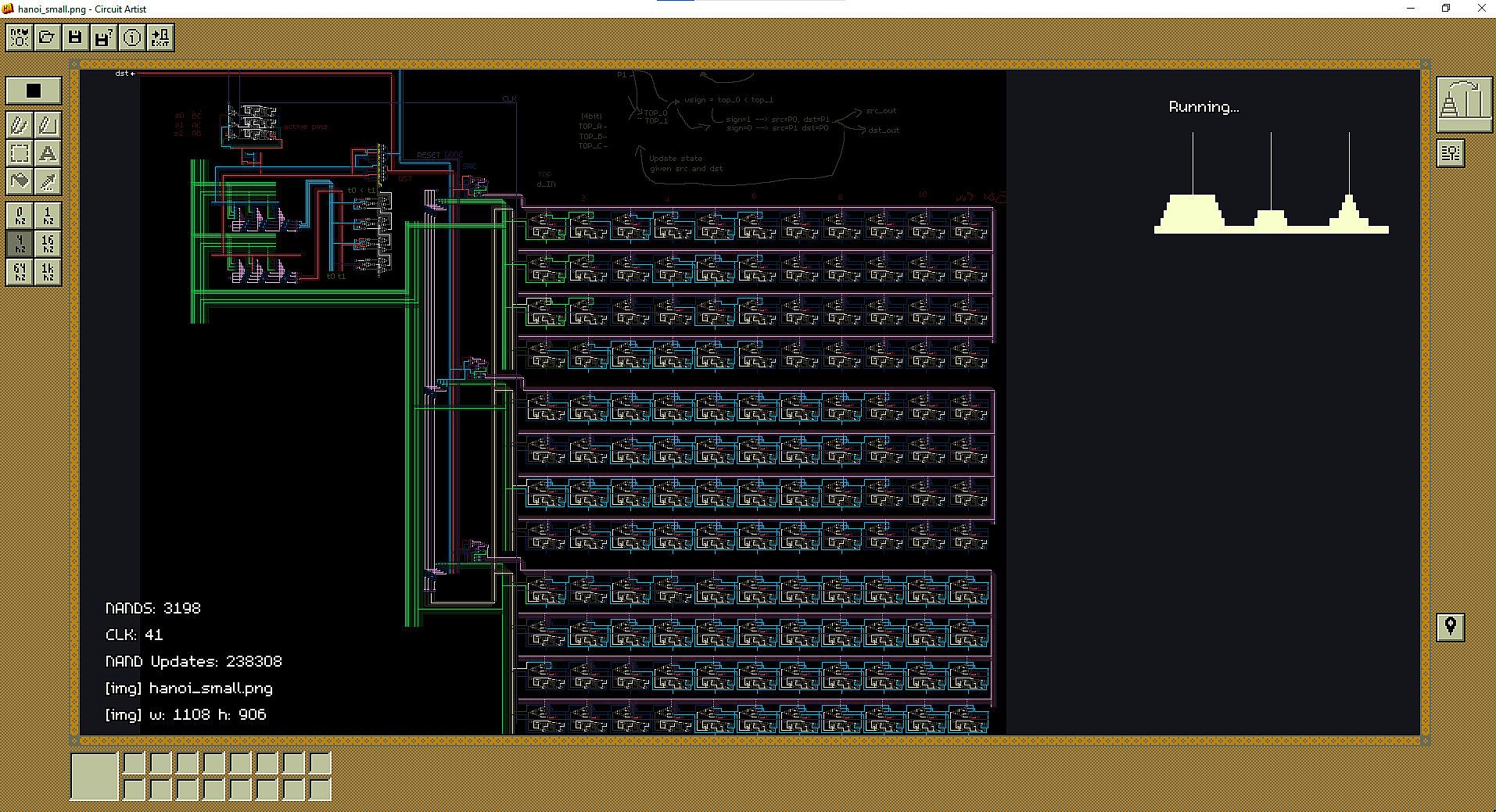Circuits make sounds based on NAND activations — they beep faster when busy and slower when idle. Another tool for developing intuition about efficiency, and it's cool.