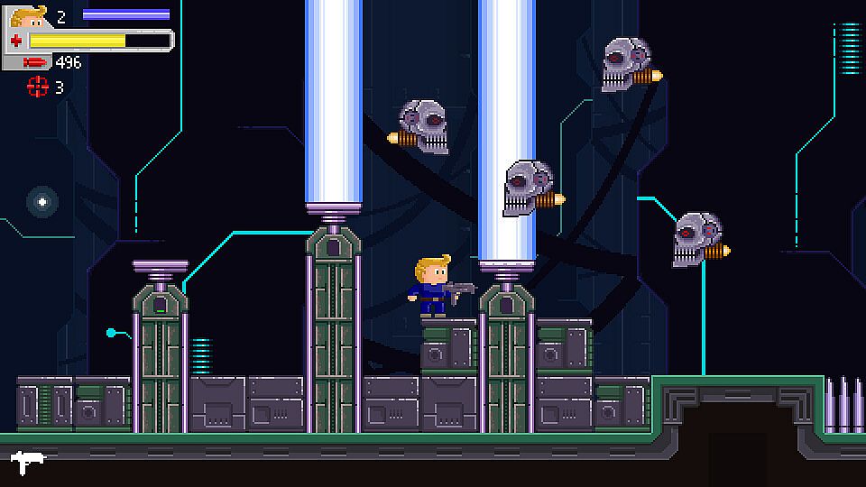 Old School platformer action - Jump and dash past insta-kill traps. Blast through enemies. Collect ammo and health. Make it to the exit in one piece. And enjoy the fine balance between platforming and combat!