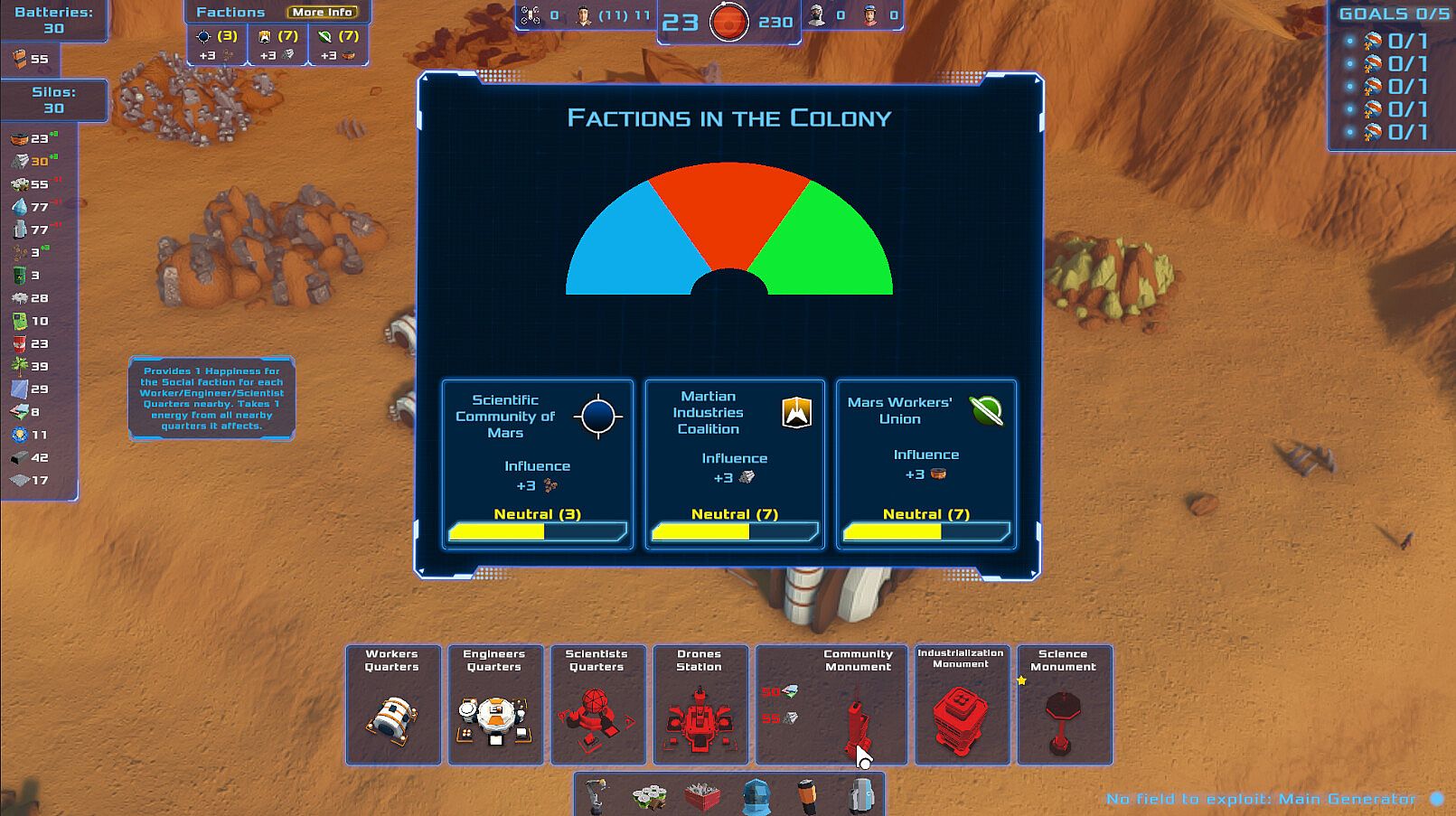 Lead a fledgling Martian settlement in this turn-based colony building game. Manage resources, expand territory, and plan each turn to foster growth amid the Red Planet's harsh conditions. Balance the demands of Social, Scientific, and Industrial faction leaders to keep your colony harmonious. Random events like Worker Strikes and Smuggler Dominance test your strategy skills. Adapt quickly to these challenges while steering decisions that ensure survival. Strategy and simulation fans who enjoy thoughtful turn-based planning will find a demanding test of leadership here.
