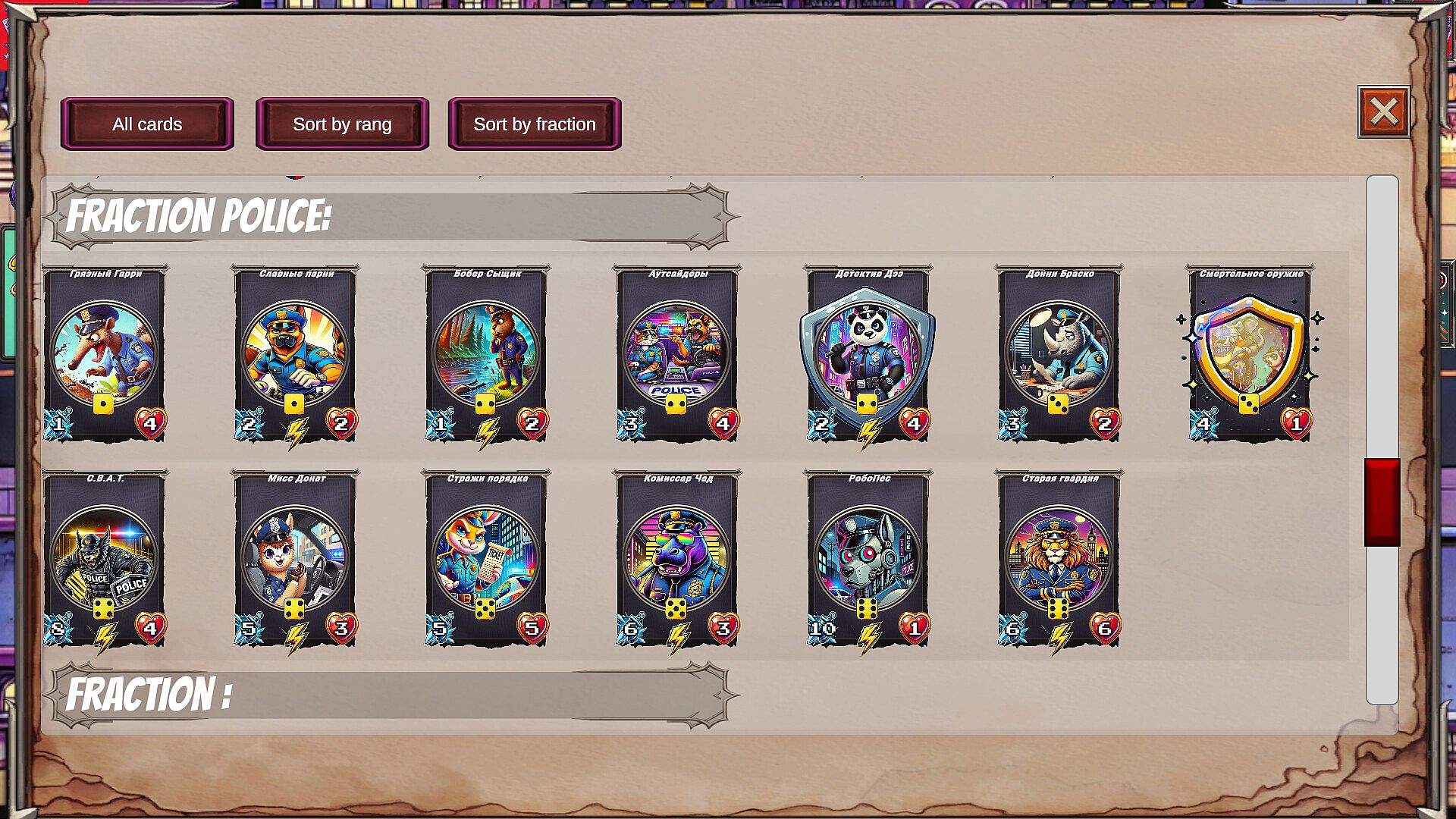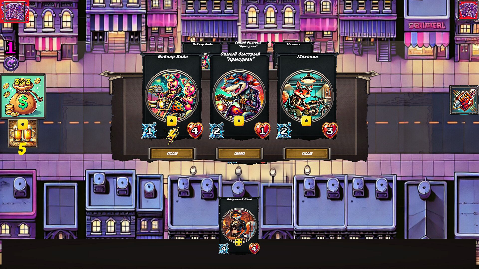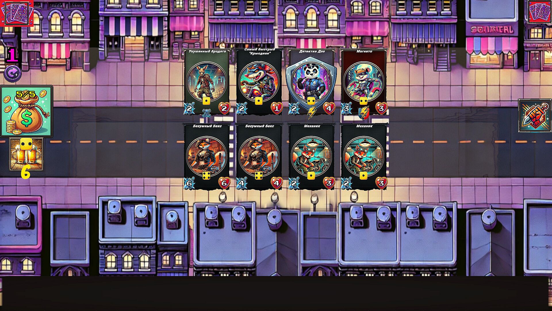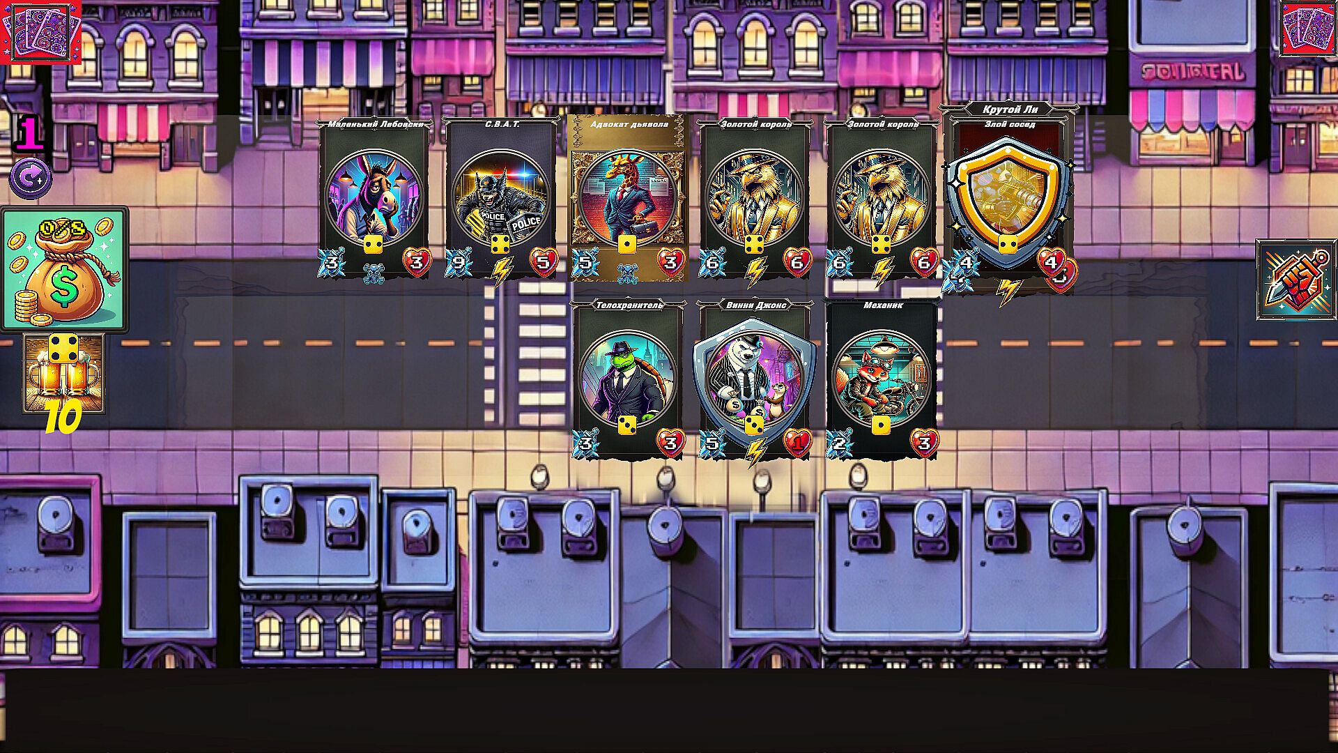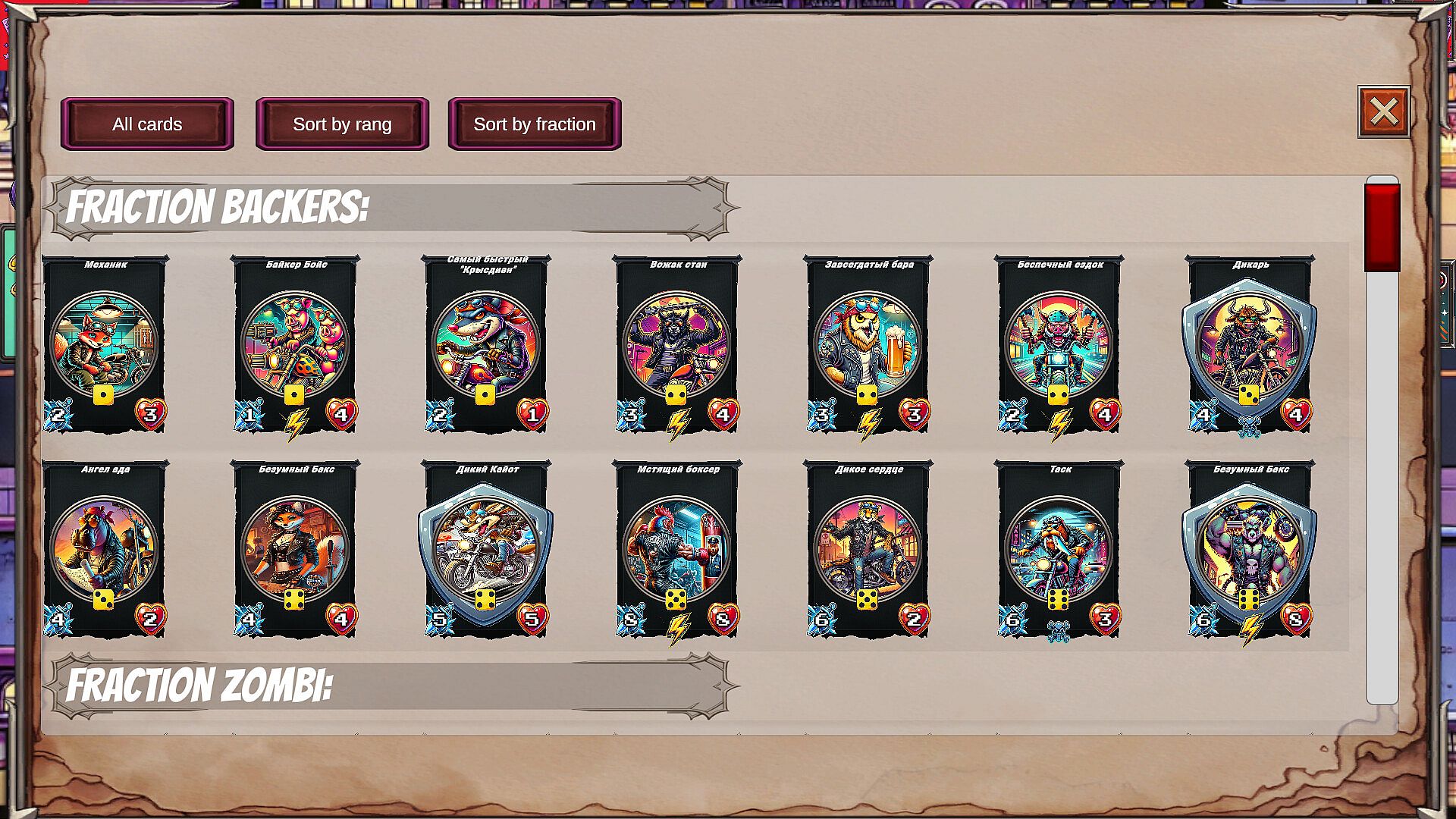 Assemble a dream team from cards of different factions — police, bikers, gangsters, zombies, and street heroes. Buy and sell fighters, combine cards, power them up, and unlock powerful synergies.