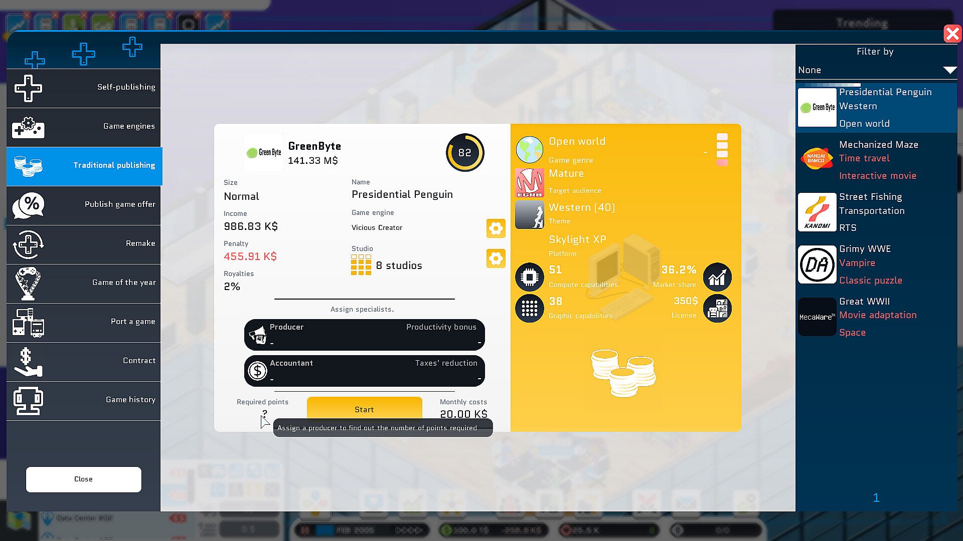 But a problem remains, even if your games are brilliant, you don't have enough fans to self-publish a big game to make your studio profitable. You will have to turn to video game editors who will carve out the lion's share. Chaining successes is the only way of getting rid of the publishers. Furthermore you will be able to publish your own publishing contracts. Then you will then be ready to dominate the market and buy back your competitors.