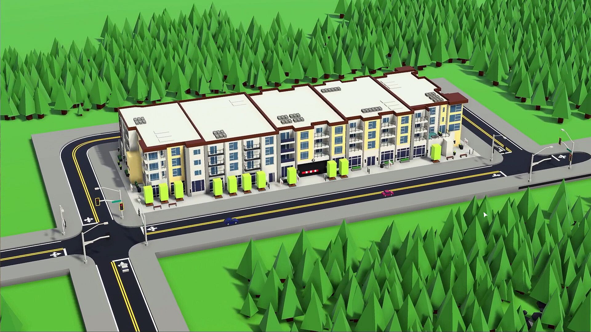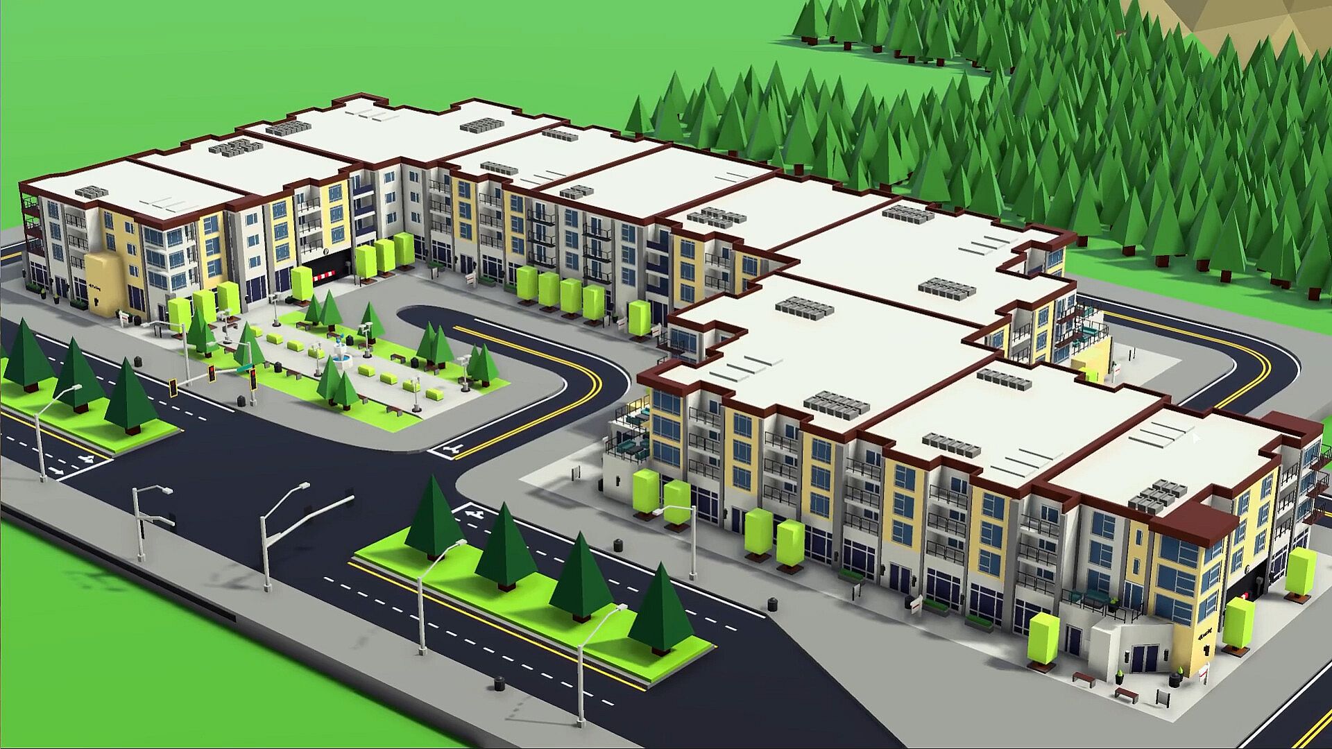 • Modern, hand-crafted, low-poly style building models and structures.
