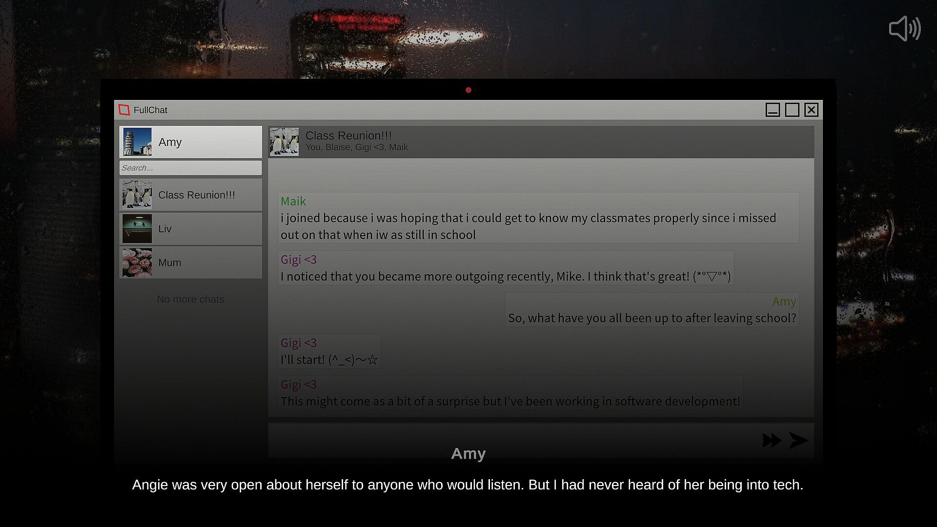 Amy gets pulled into a group chat from her old classmates, meant for catching up years later. Disturbing details about them surface fast, making her doubt who lurks behind the texts. This casual visual novel delivers a tense warning through its authentic chat setup on PC. Players type Amy's exact messages, shown in gray until black overlay matches perfectly-dots and commas count. Hit Enter or the send button to dispatch once correct. Over 5000 words span 20-30 minutes of original music and sound design, hooking fans of precise text input in indie casual games.