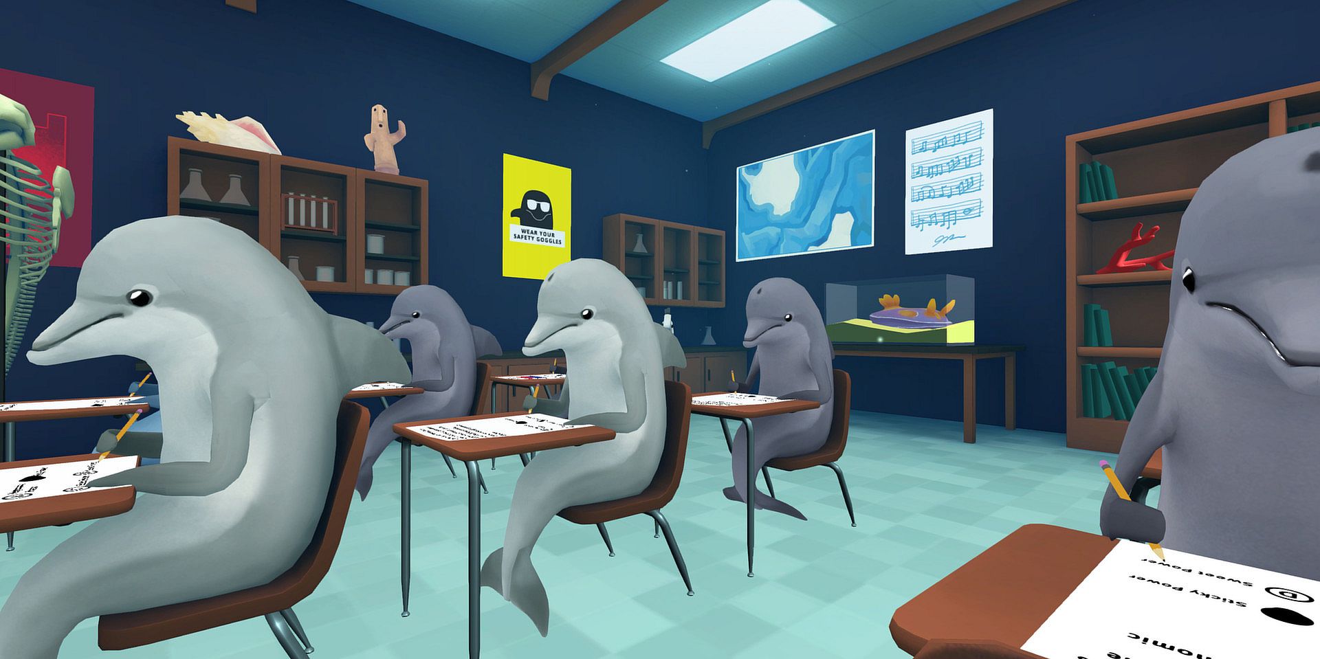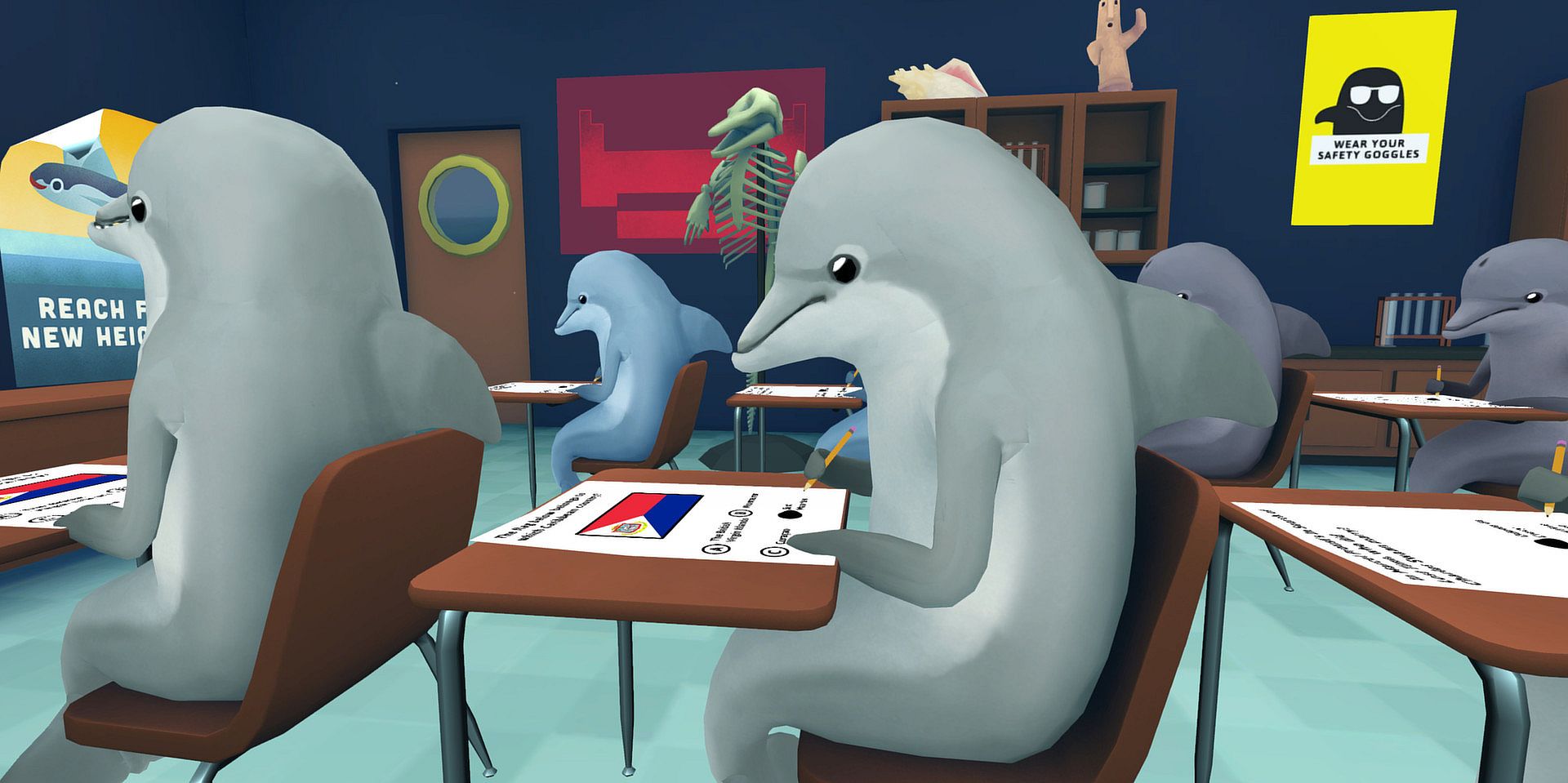 Classroom Aquatic is the world’s first underwater stealth school simulator! Players play as a foreign exchange diver student in a school for dolphins, going through a semester of tests they are in no way prepared for. They must cheat, sabotage, and manipulate their way to top of the class!