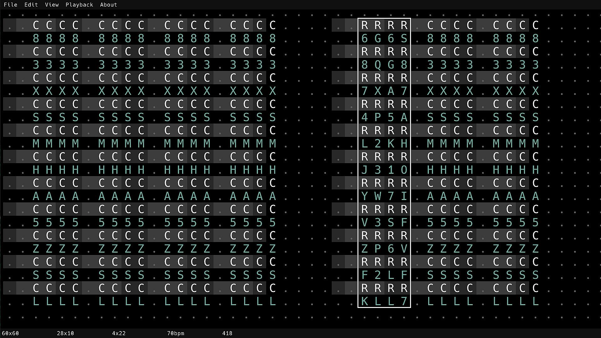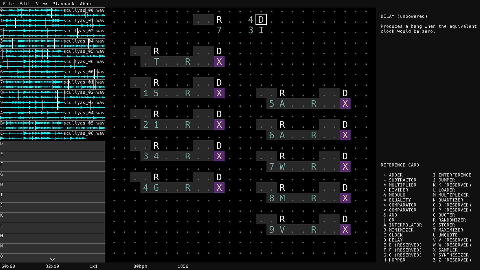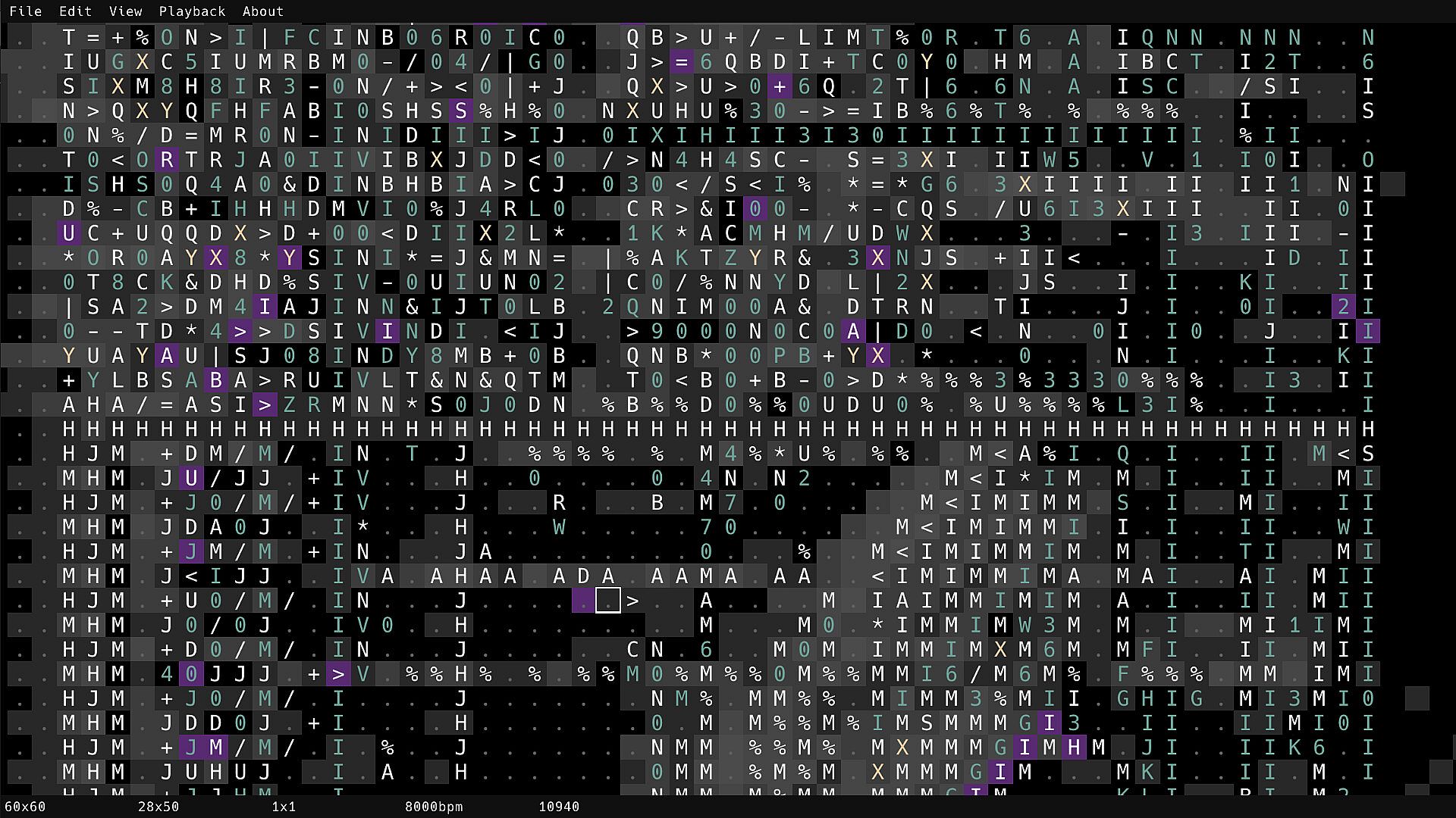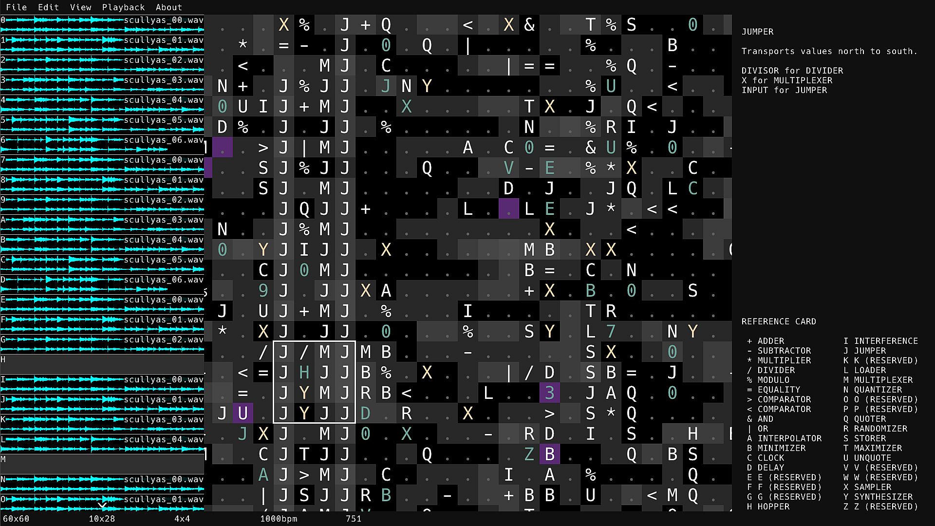 CLAVIER-36 is a live programming language for generative music, inspired by the world of cellular automata. Compose music by writing strange programs that evolve over time and take on a life of their own.