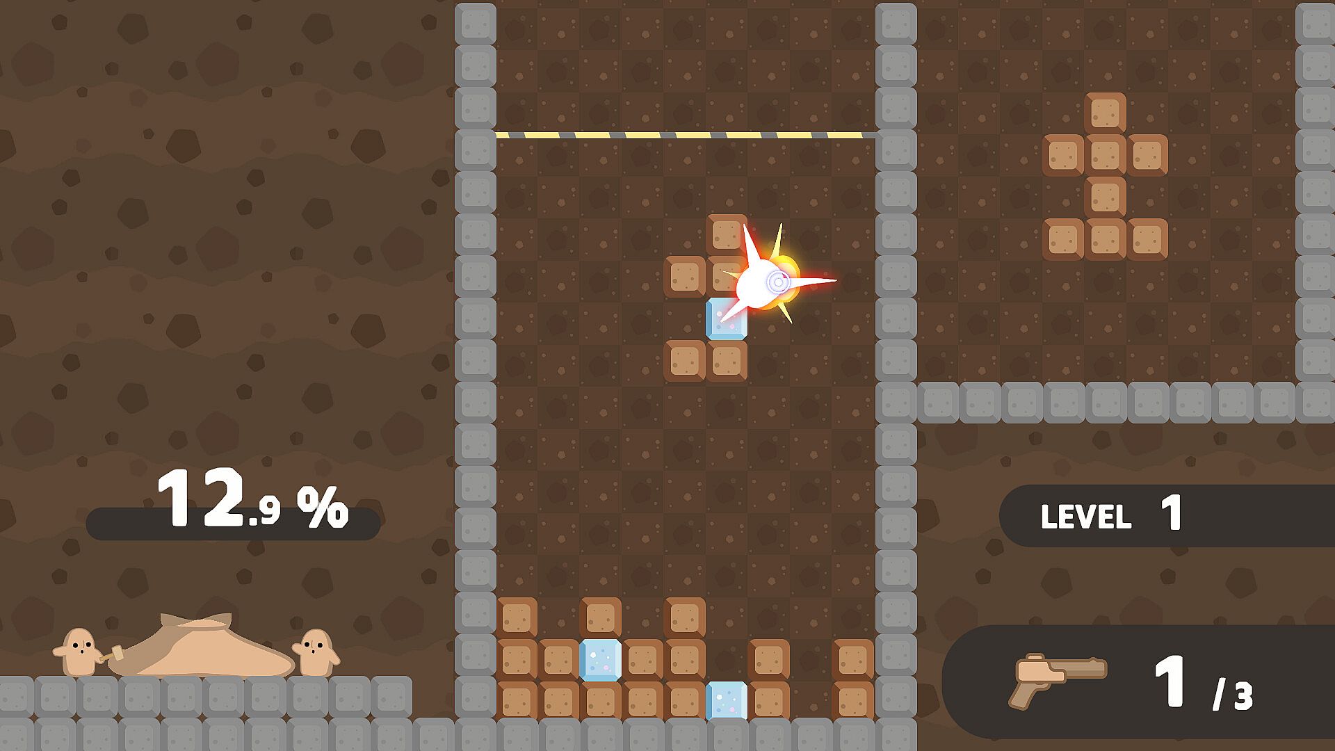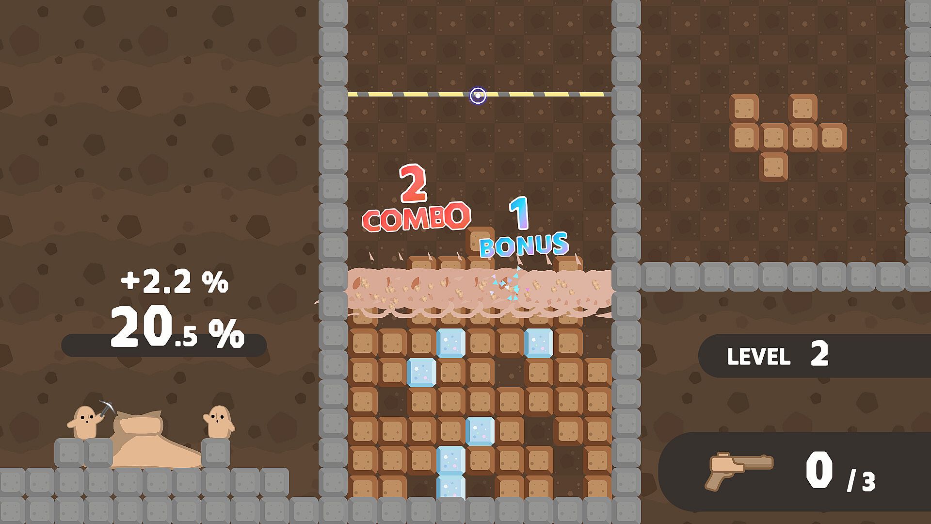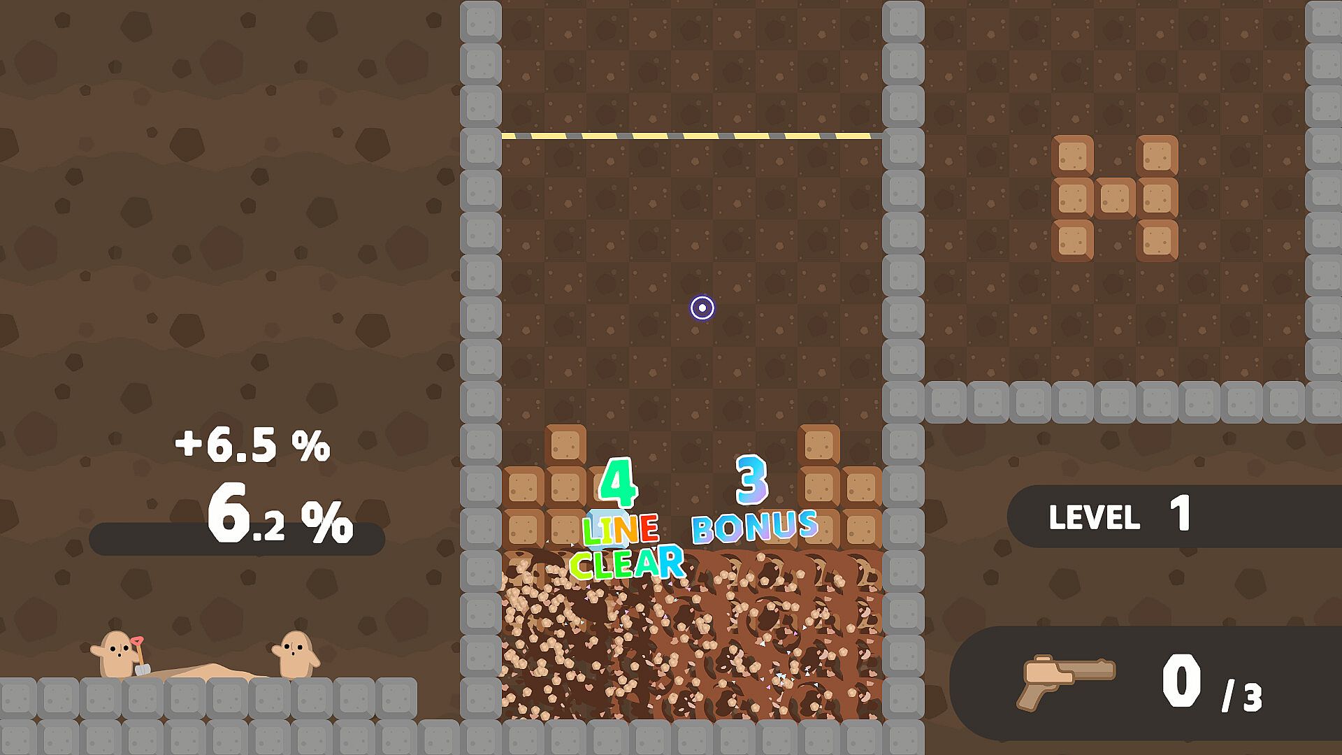 • When you clear a complete horizontal line, the blocks vanish, and the workers progress in their task. Make combo or clear multiple lines at once to give their progress a big boost!
