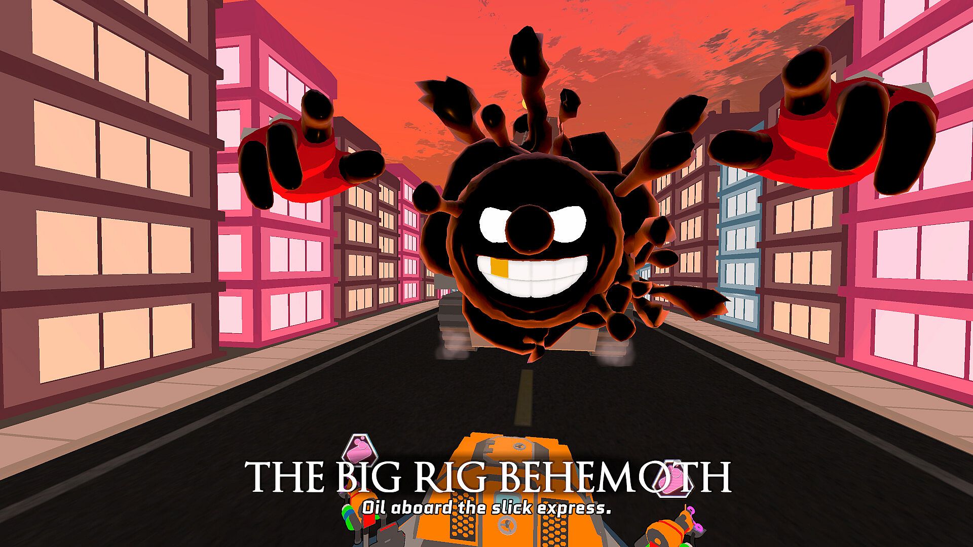 Clean Getaway is an award-winning 4-player couch co-op game. Your journey begins with Dr. Coney, a brilliant scientist who also happens to wear a traffic cone at all times. She’s had her free clean energy source stolen by Big Oil, an evil hive mind of sentient oil led by the Big Rig Behemoth. As her appointed strike team, it’s your job to get her research back and stop Big Oil once and for all – and maybe save Dr. Coney’s missing wife along the way!