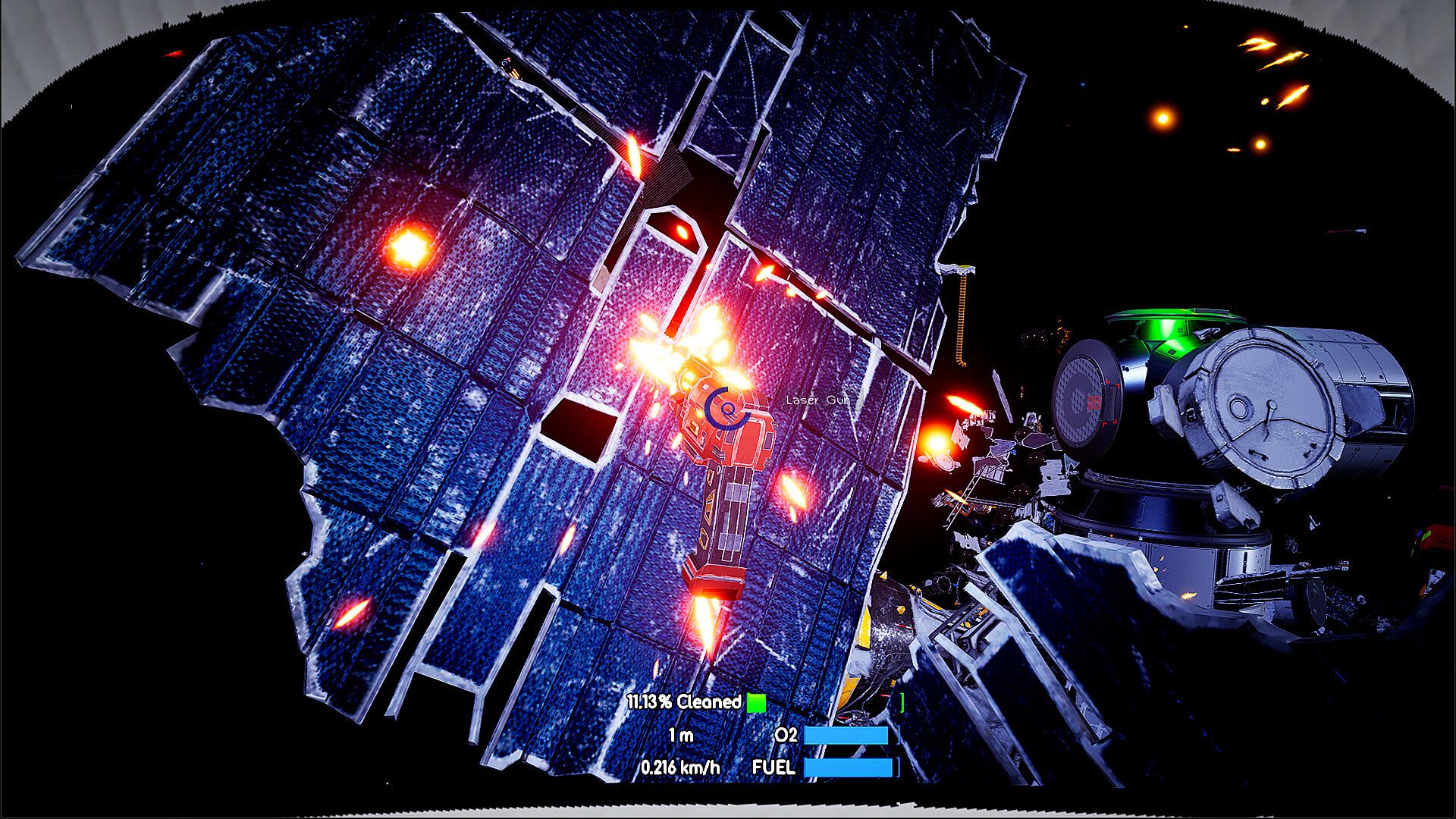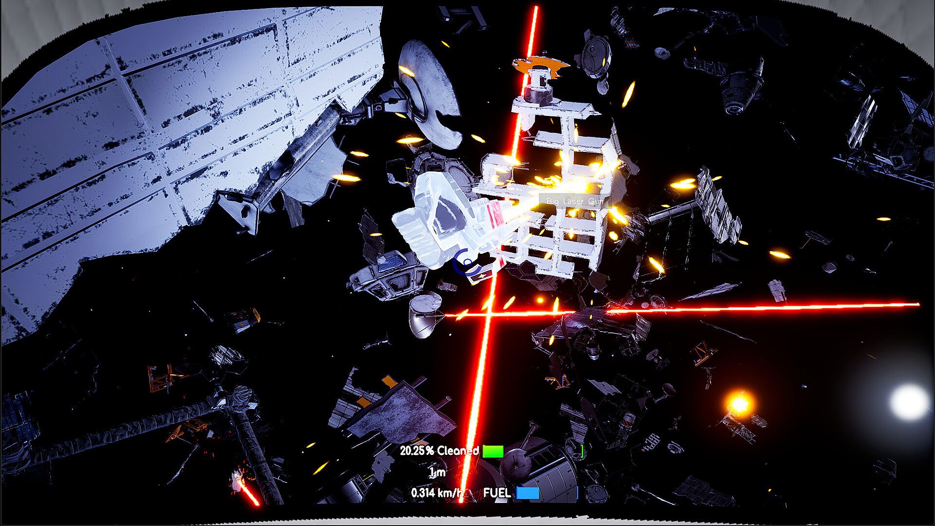 Grab the laser gun and swing it around to clear debris. There are two types, each with different power levels and ranges.