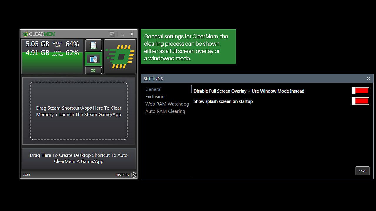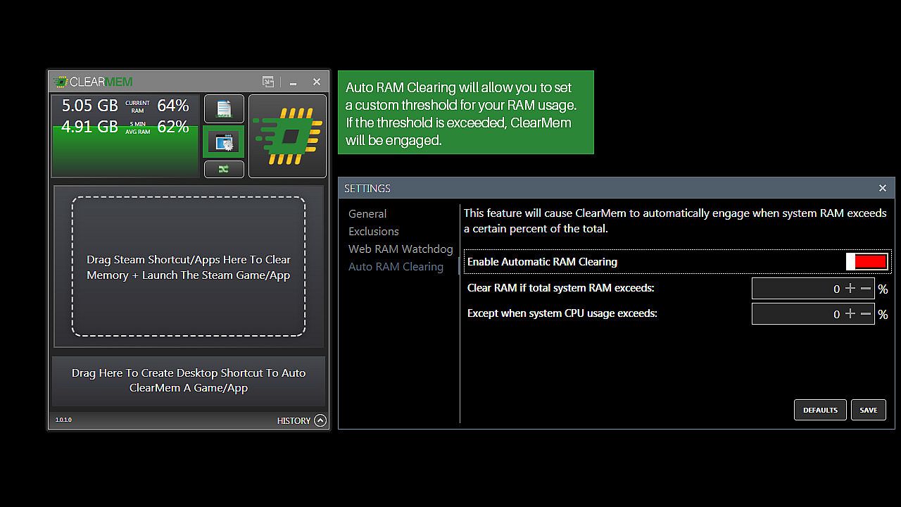 - Direct Steam Integration - Drag/Drop any Steam shortcut to auto-engage ClearMem and Launch your game!